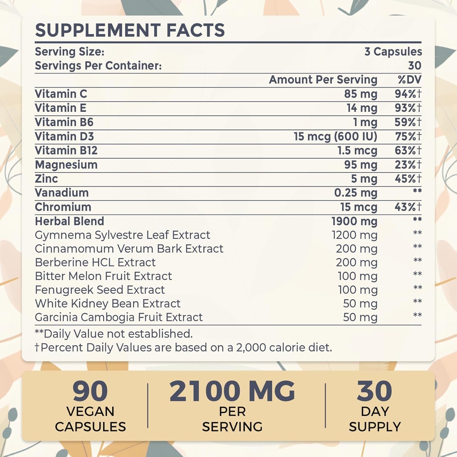 ESSENTIAL VITAMINS & MINERALS: Our Gymnema supplement is fortified with vitamins C, E, B6, D, B12, magnesium, zinc, vanadium and chromium. These essential nutrients have been carefully selected to support overall well-being, aligning with a lifestyle of wellness and vitality
