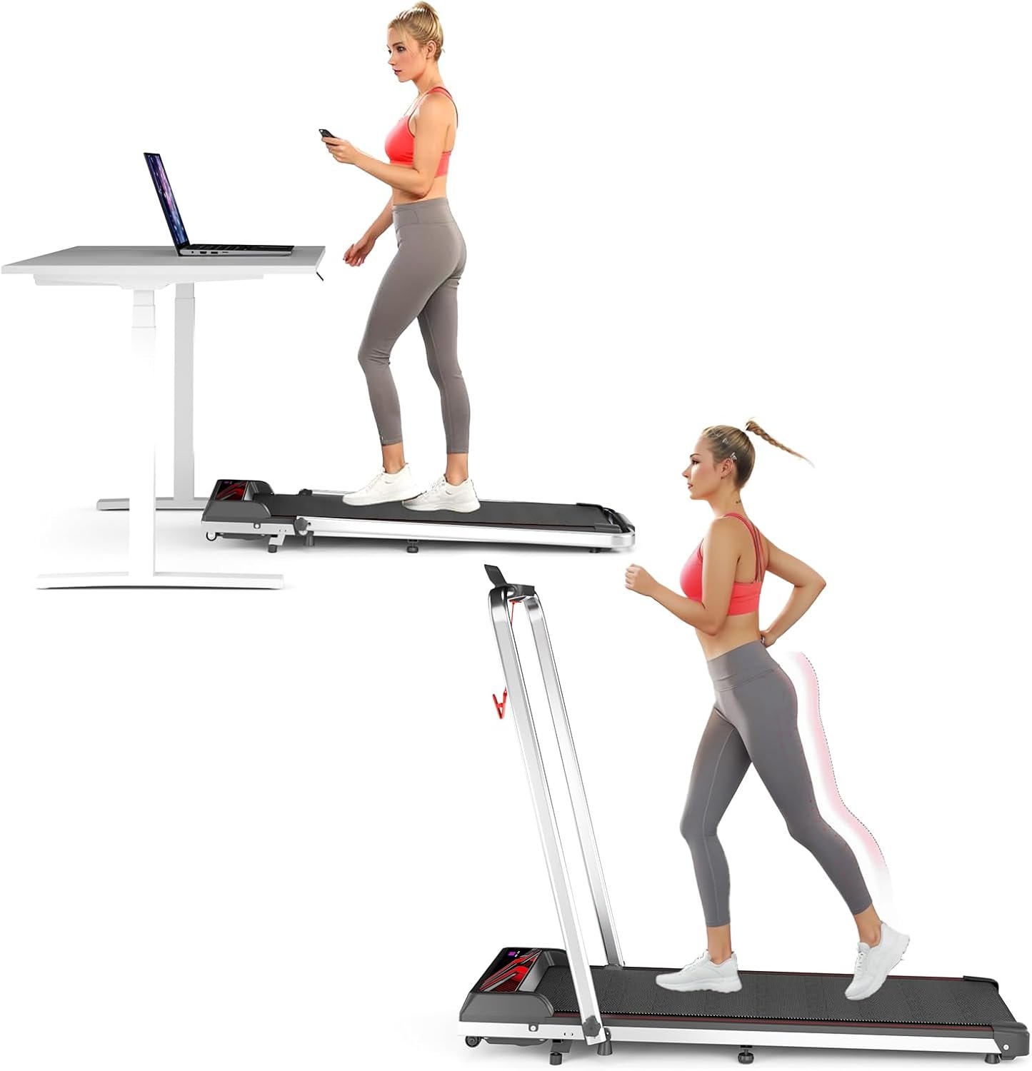 2 in 1 folding treadmill with two exercise modes. Walking mode speed range is 0.6-3.8mph, and running mode speed range is 0.6-7.6MPH. This allows the treadmill to adapt to your personal exercise needs, whether low- walking or high- running.