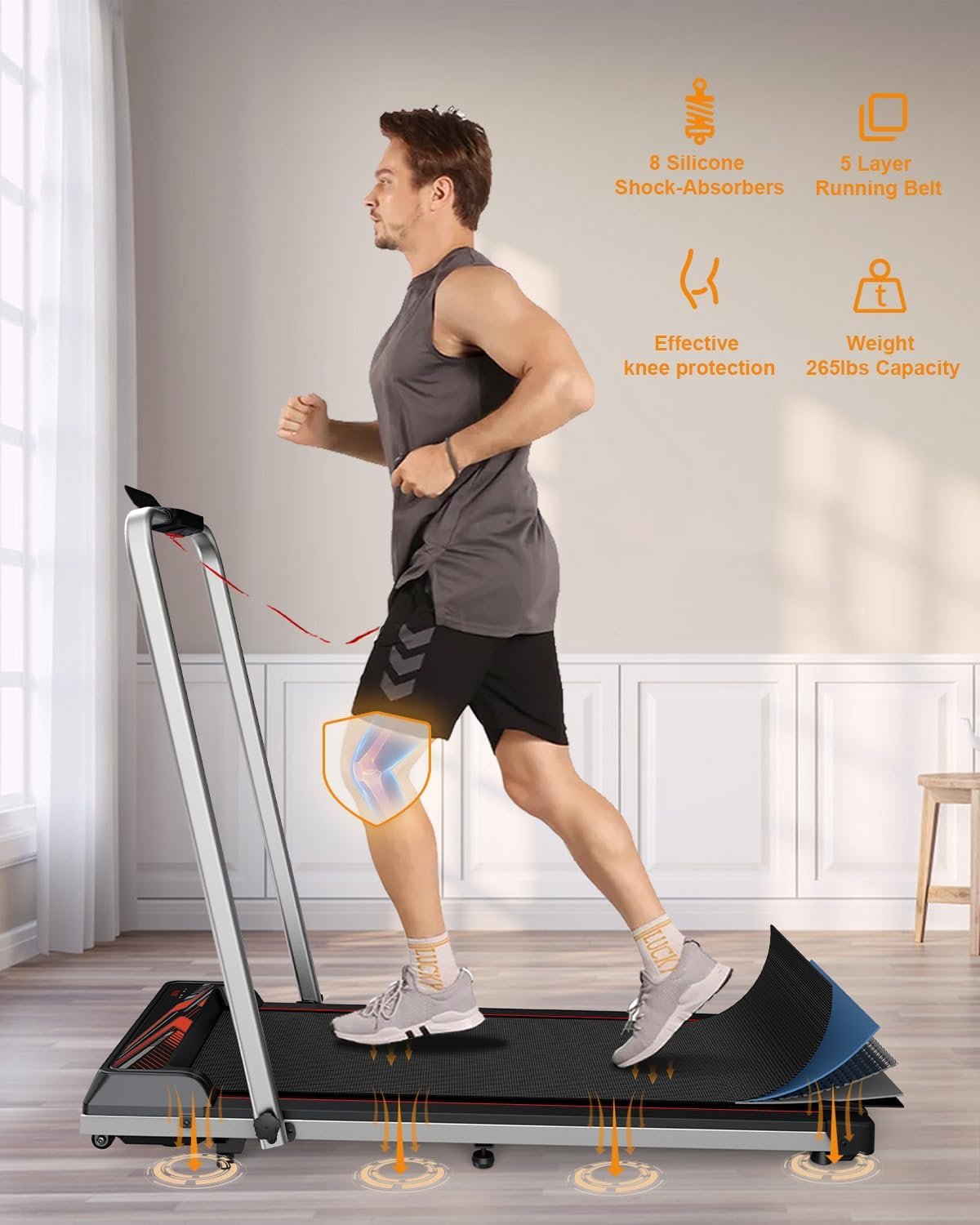 FIVE-LAYER NON-SLIP RUNNING BELT & SHOCK ABSORBENT SYSTEM: This treadmill features a five-layer non-slip running belt that provides a running area of 39.37″ x 15.75″. It is equipped with a shock absorbing system that cushions your knees, muscles, and ankles, making it safer and more comfortable for you to run and walk on the treadmill.