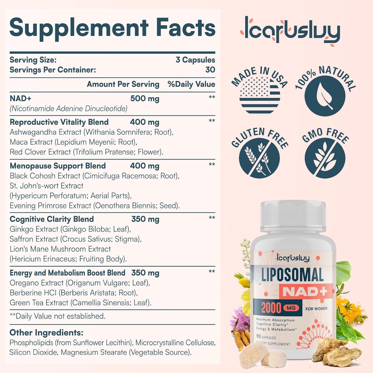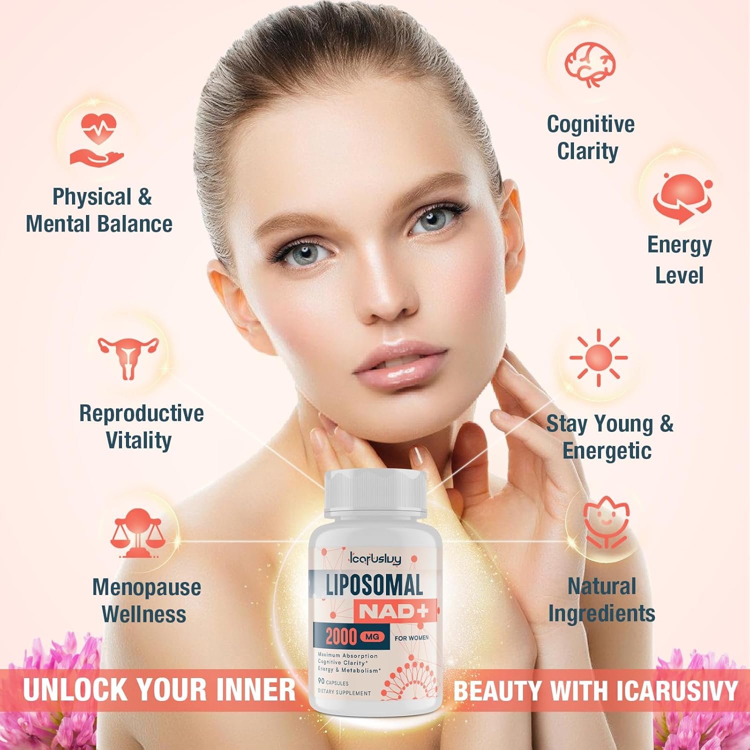 Menopause Wellness and Vitality – The feature of our NAD plus supplement is 400 mg menopause support blend is composed of black cohosh, st. john’s wort, and evening primrose extracts. This combination helps maintain balance and well-being during the menopause transition. The blend is tailored to address the unique changes women experience as they age. Eelevate your well-being with IcarusIvy liposomal NAD+.