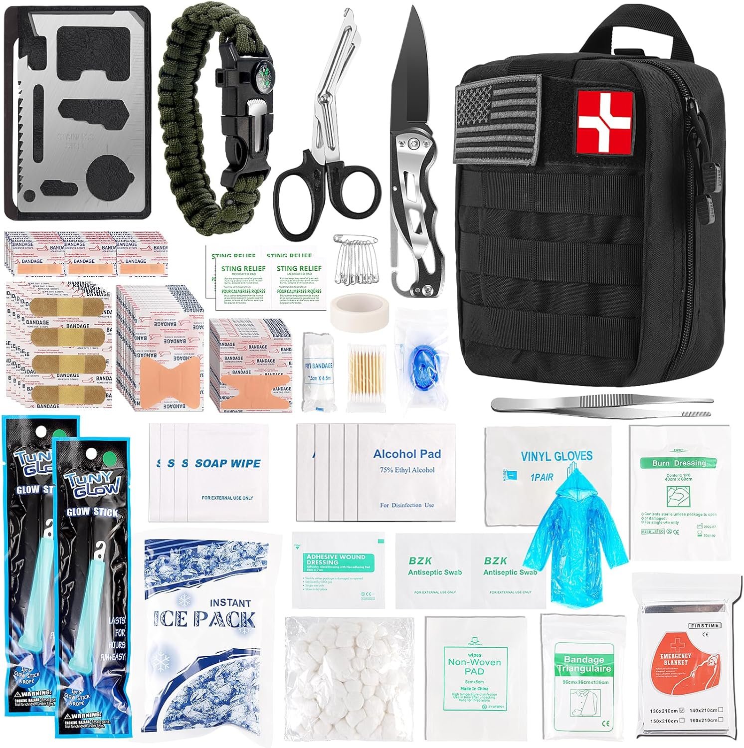 【Essential Survival Tools and First Aid Supplies】The survival first aid kit contains popular and essential survival gear and equipment, like survival bracelet, knife, multitool card, emergency blanket, 12-hour glow stick, and emergency rain poncho, as well as large amount of emergency medical supplies, such as various bandages and pads, compresses for burn, adhesive wound dressing, triangulaire, non-woven medical tape, etc.