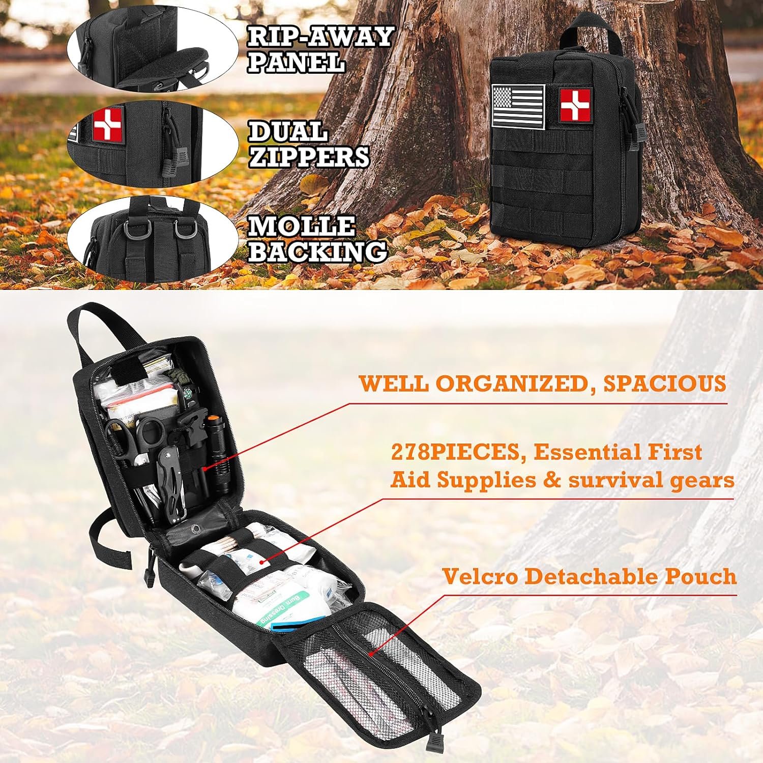 【MOLLE Pouch, Durable & Portable】The emergency kit come with a military grade MOLLE bag, which is made of 1000D nylon, lightweight and durable. Inside the bag, there are three large compartments and several straps, all survival gear and equipment are stored in an organized and easy-to-find manner, making it easy to locate necessary items in an emergency situation. At the back of tactical pouch, there’s a removable Velcro system, so that you can carry this survival kit on your tactical backpack.