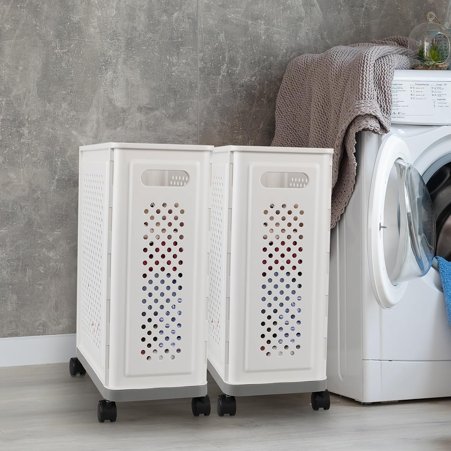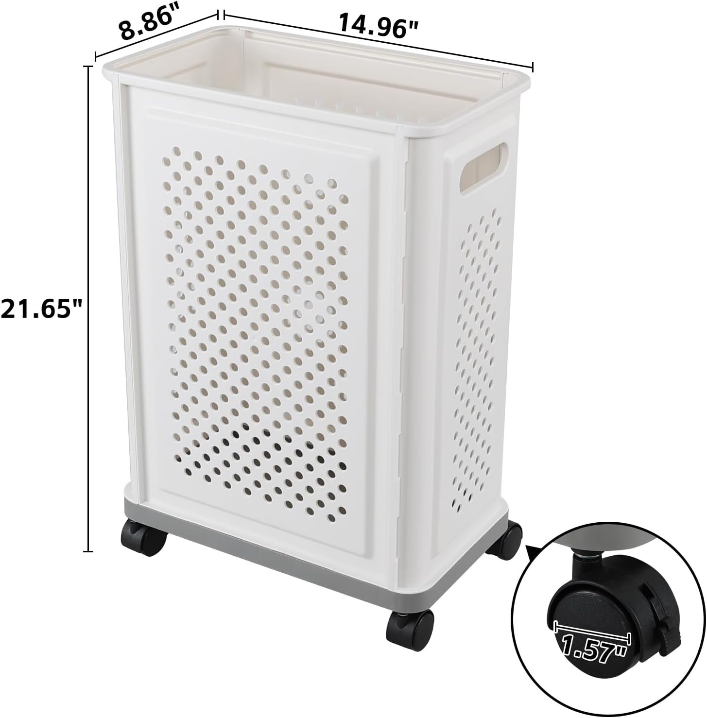 Yoga Mat Storage Bins with Wheels, White Slim Laundry Hamper, Home Gym Plastic Storage Baskets