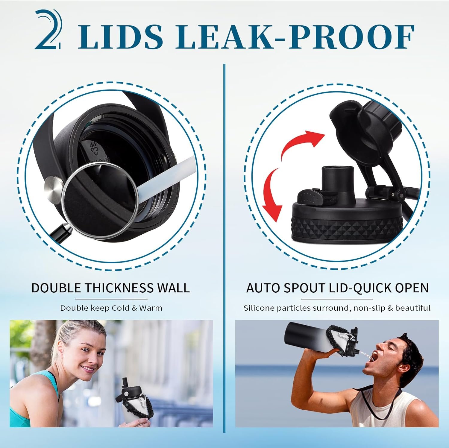 LEAK-PROOF 2 LIDS – AUTO SPOUT LID & STRAW LID meet you different drinking need, and both lids are leak proof and with handle for carrying on the go. The pop-up spout lid features a button for one hand open quickly, and a large water outlet for fast drinking. The straw lid with straw lets you enjoy spill-proof sipping to all your outdoor adventures, also can prevent the inhalation of ice cubes