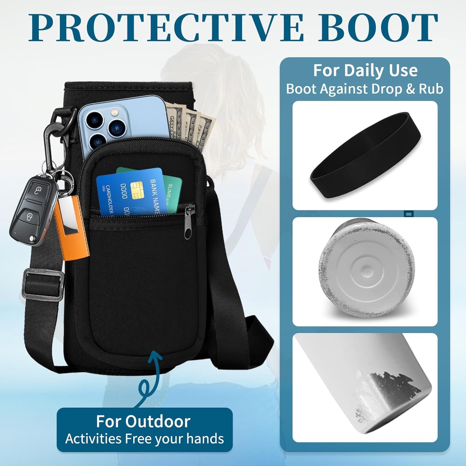 The storage bottle pouch with shoulder strap and zipper pockets help you tote your water bottle easily from place to place, motivate you staying hydrated throughout the day