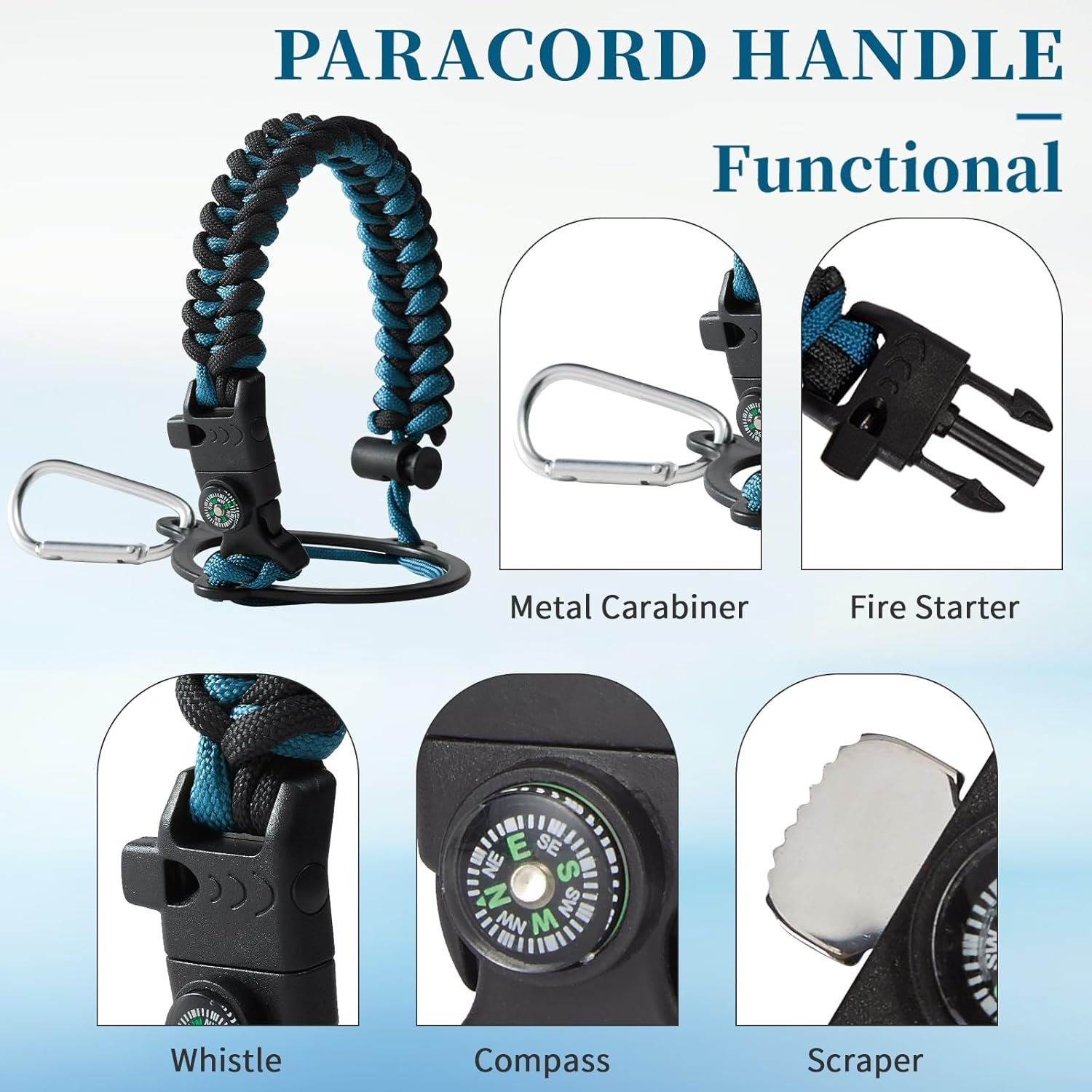 Durable and stylish way to carry water bottle, Paracord cord with many wild survival tools, compasses, flints, whistles, it will make your travel easier