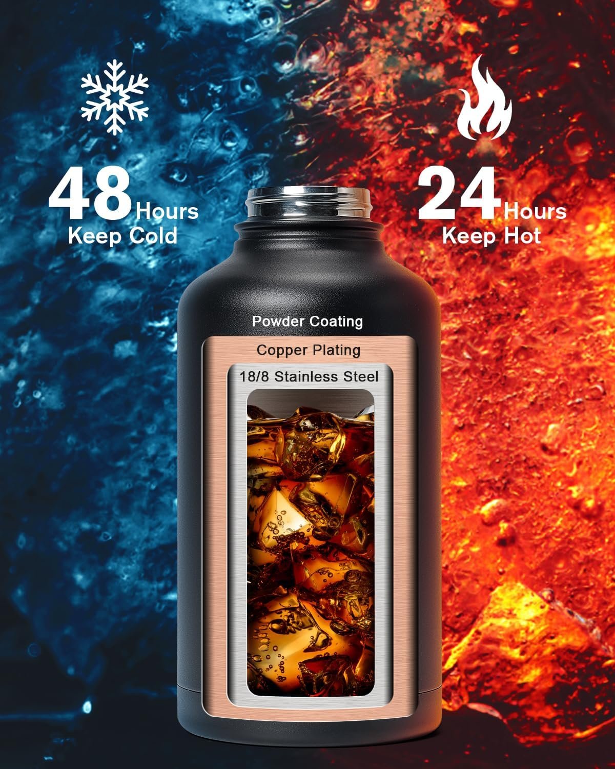 Cold for 48H & Hot for 24H:Topre 64 oz Half Gallon Insulated Water Bottle features advanced double-wall vacuum insulation with copper plating, the water flask preserve the freshness and temperature of your drinks throughout the day.