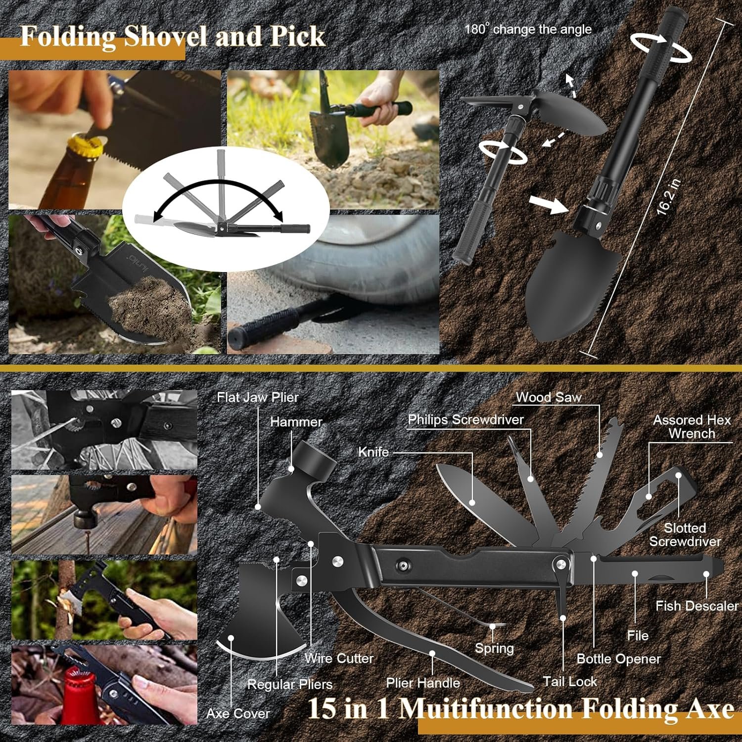 【High-quality Survival Gear and Equipment for Camping or Home Needs】 The survival first aid kit offers high-quality and professional tactical survival tools to ensure you will be well-prepared under any emergencies. The kit contains: 14 in 1 hatchet, folding shovel and pick, collapsible tent lantern, tactical flashlight, survival bracelet,multi-tool card, fire starter, emergency blanket, 12-hour glow stick, wire saw, and emergency rain poncho.