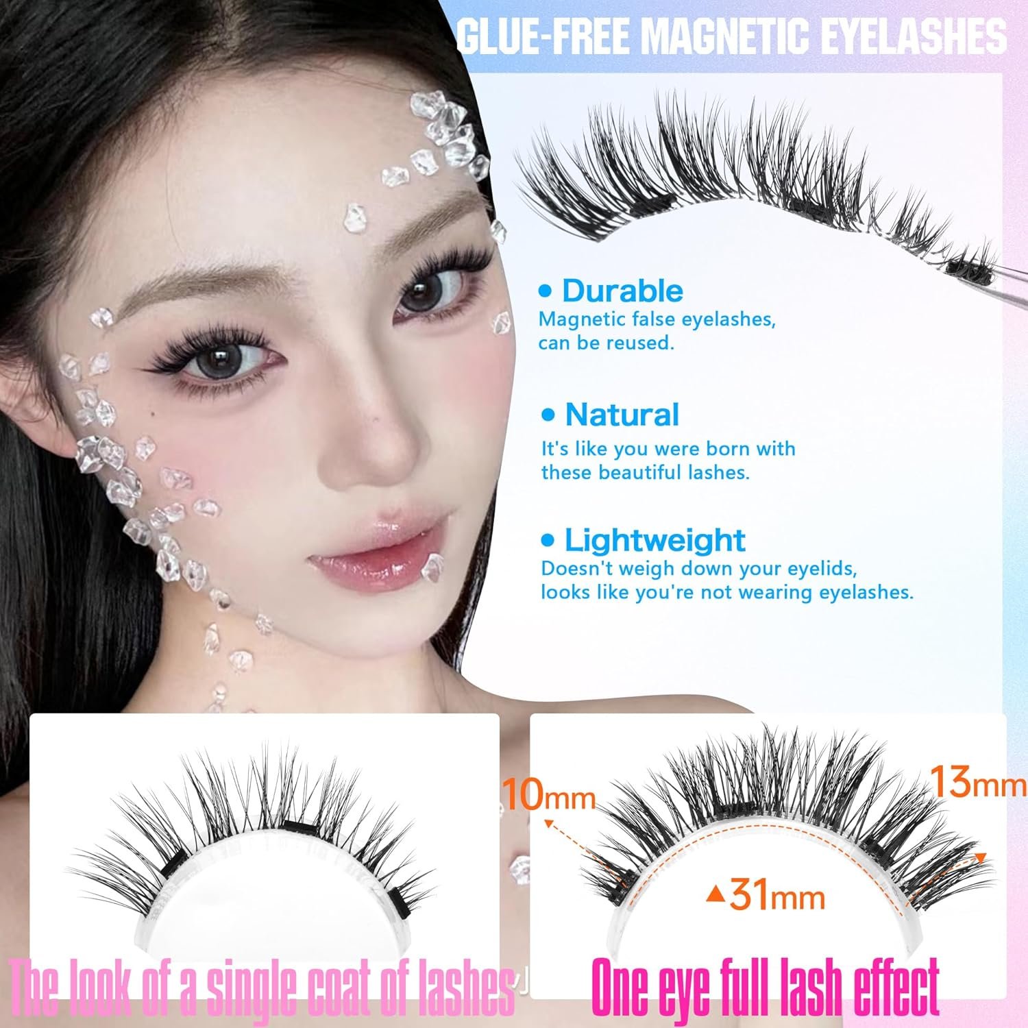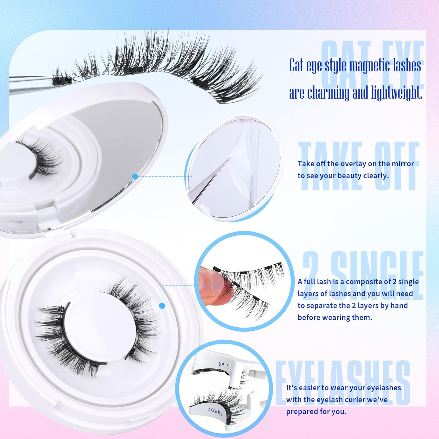 ALICROWN has finally released magnetic eyelashes! Sorry everyone for the wait! Contain: 1 pair magentic eyelashes, tool used while wearing Magnetic lash style: natural, cat eye, wispy, fluffy Durable: as long as the magnetism stays on, then it can be used all the timeParticular attention: Magnetic lashes are meant to be clamped onto your own lashes, if you have very few lashes that are not strong enough to support magnet lashes, or if you don’t have lashes, move over to our traditional strip lashes or self-adhesive lashes, which will be more adapted to your situation.𝐀𝐛𝐨𝐮𝐭 𝐭𝐡𝐞 𝐚𝐟𝐭𝐞𝐫-𝐬𝐚𝐥𝐞 & 𝐫𝐞𝐭𝐮𝐫𝐧: ALICROWN offers you absolute peace of mind after the sale. Yes, the system has recently categorized our magnetic lash products as non-returnable, however! If you can’t get used to the magnetic lashes but can’t find a place to return or exchange them, please contact us and we’ll be sure to get it resolved.Next open this new means of beauty with ALICROWN!Magnetic fake lashes no longer require eyelash glue to be involved, and the simplicity makes beauty easier.Traditional strip lashes are more demanding on the condition of your skin and the lash glue, for example, they need to be applied when your eyelids are oil-free and dry, or when your skin is oily, traditional lashes may not be able to stay on your eyelids…This will not be the case at all with magnet lashes! Because it relies only on the suction of the magnets on the upper and lower lash bands, it doesn’t depend on your skin’s condition.𝐀𝐬 𝐥𝐨𝐧𝐠 𝐚𝐬 𝐭𝐡𝐞 𝐦𝐚𝐠𝐧𝐞𝐭𝐢𝐬𝐦 𝐬𝐭𝐚𝐲𝐬 𝐨𝐧, 𝐰𝐞 𝐰𝐢𝐥𝐥 𝐚𝐥𝐰𝐚𝐲𝐬 𝐥𝐨𝐯𝐞. You can keep using them as long as the magnet lash’s magnetism stays intact, which completely breaks the limitations of traditional lashes for true reusability.💜Classic false eyelashes never go out of style! We chose natural fluffy cat eye lashes to make magnetic lashes. Even with magnets on the bands, natural lashes don’t bring a lot of weight to the eyelid. The gradual lengthening of the cat eye lashes from the inner corner of the eye to the outer corner of the eye makes them suitable for a wide range of eye shapes and can make your eye makeup look cute and charming.