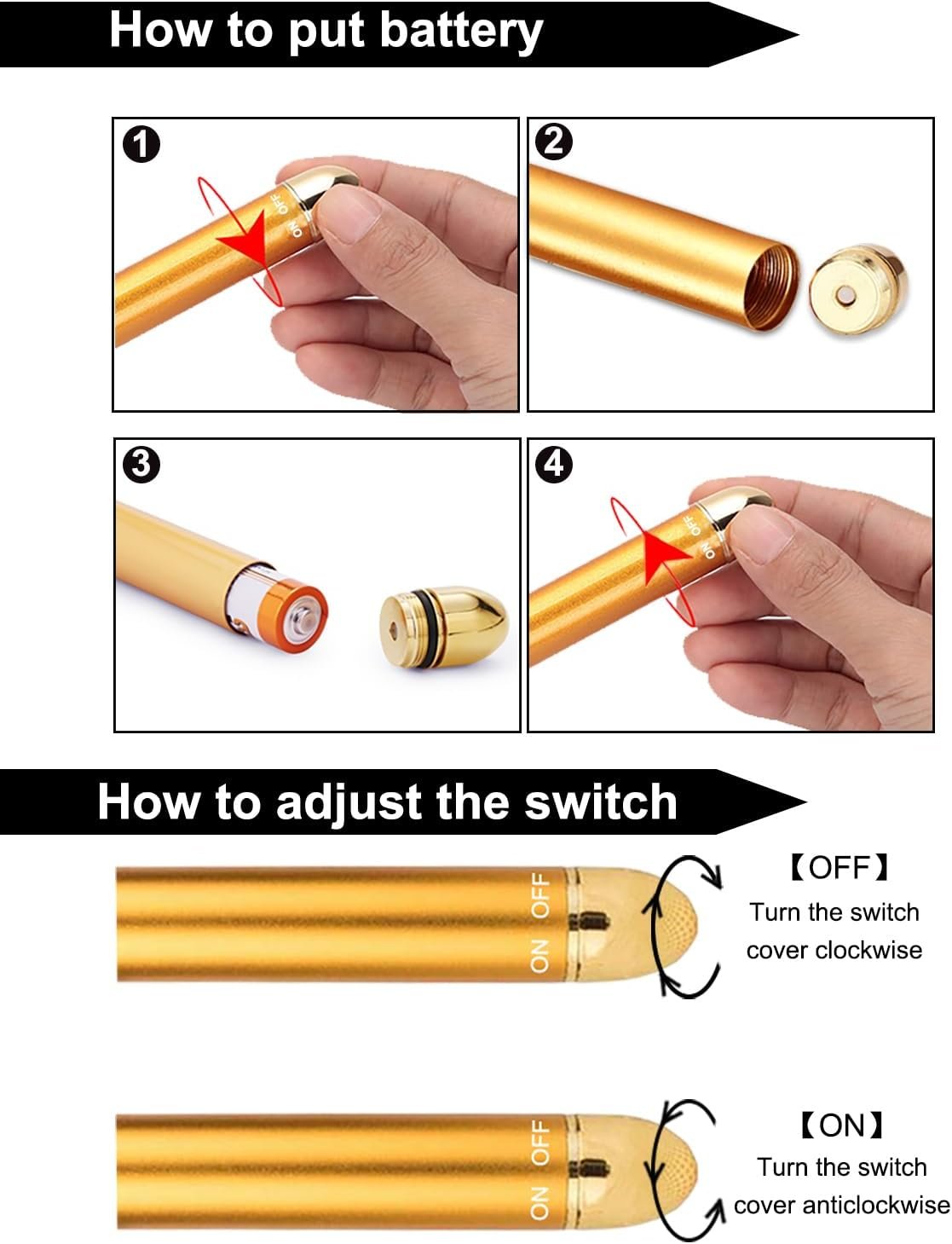 Note: Requires one AA battery (not included ), electric power driven. Besides, manual control twist On/Off. Important Note: Some brands rechargeable AA battery is oversize, if you could not put battery into the device. Please change other brand AA battery.