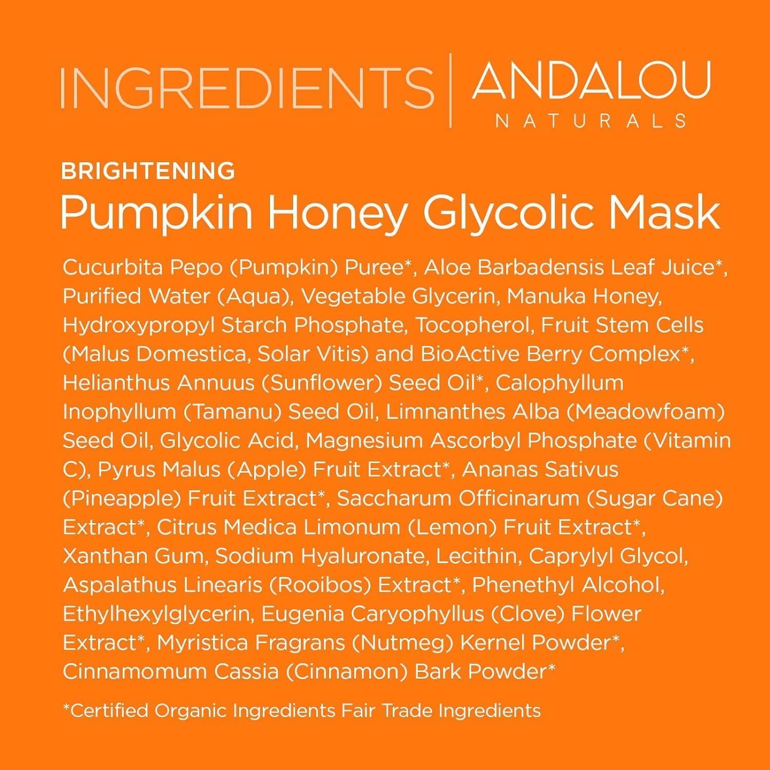 EXFOLIATING FACE MASK: Andalou Naturals Pumpkin Honey Glycolic Face Mask harnesses the power of fruit stem cells, vitamin C and glycolic AHA to gently exfoliate and reveal a more luminous complexion, leaving your skin more glowing and refreshed