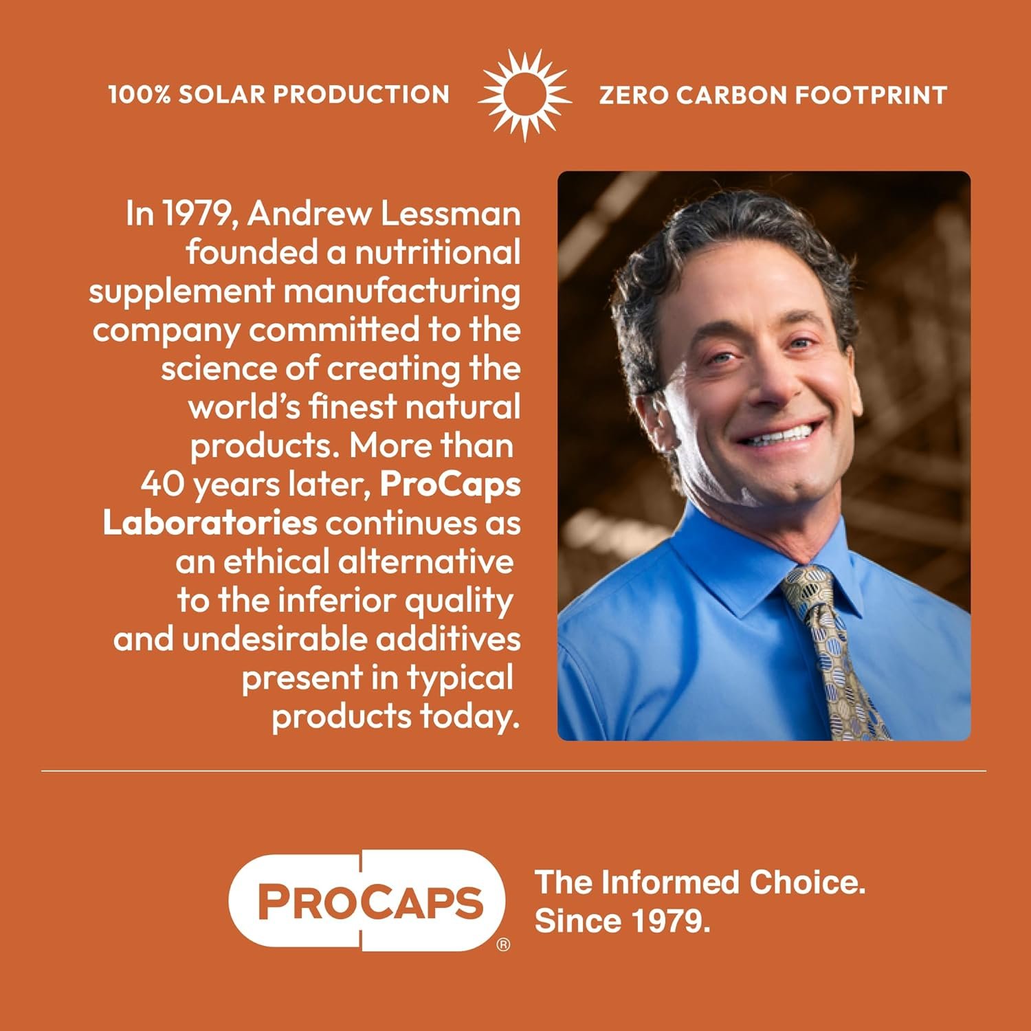Ethical & eco-friendly. zero carbon footprint – Uniquely committed to your health and the health of the planet, ProCaps’ facilities are 100% Solar Powered with a Zero Carbon Footprint and an LEED Gold green building status. All ProCaps bottles are made from 100% recyclable post-consumer resin. Plus, Andrew Lessman and ProCaps are the largest donor of prenatal vitamins in the world (over 2 billion capsules donated to date). ProCaps, the Informed Choice for Nutritional Supplements.