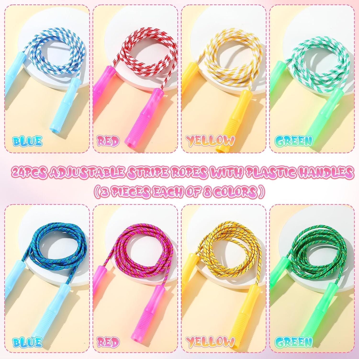 Bulk Pack for Ample Supply: this package comes with 24 jump ropes in 8 colors, 3 for each color, making it a good purchase for group activities at gym, or family gatherings; The bulk jump ropes would ensure there’s always an extra rope available for anyone wanting to join the fun, promoting an active lifestyle for everyone