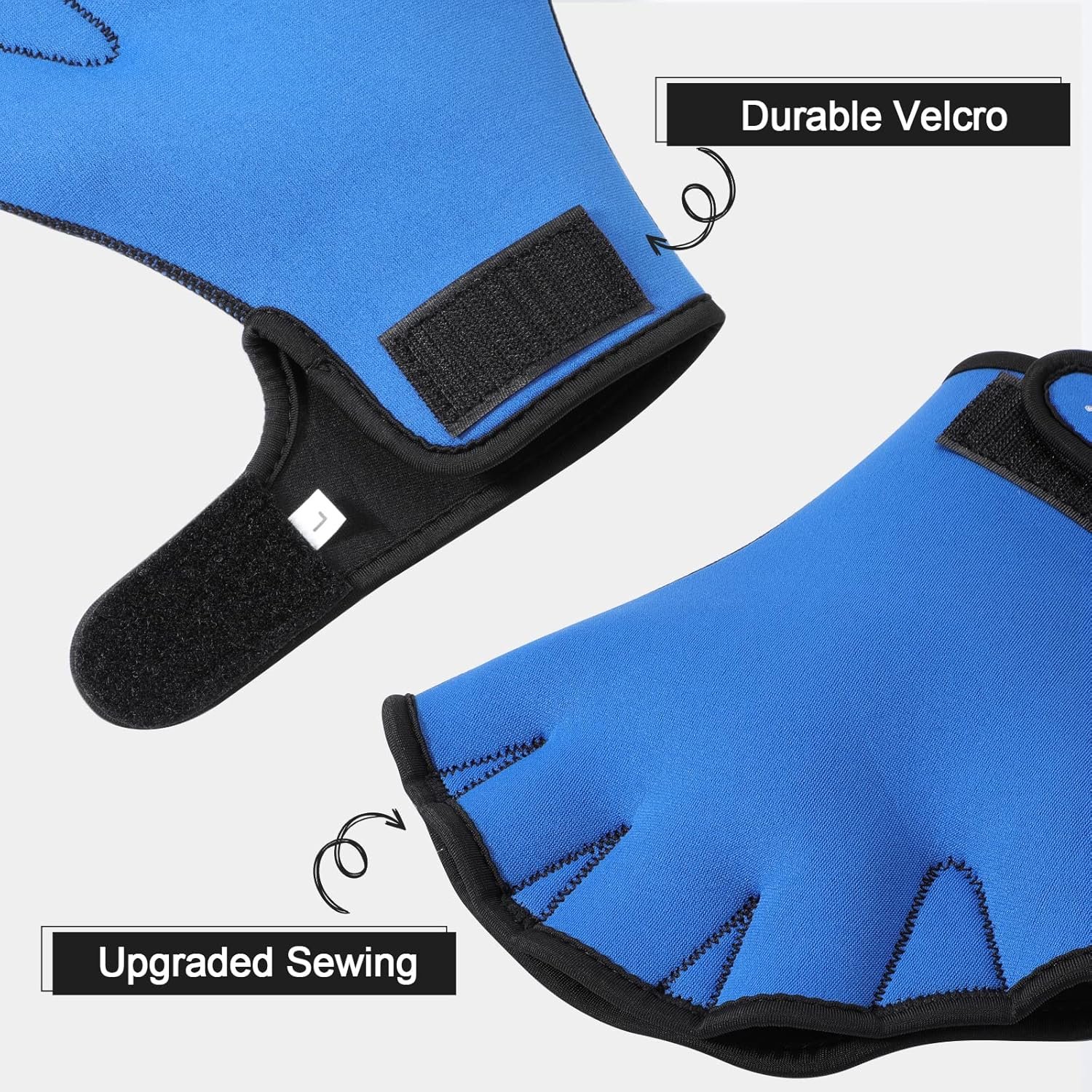💦EASY GETTING ON & OFF: Swimming gloves are easy to put on and take off, with a Velcro closure to allow some adjustment of the wrist strap to prevent it from falling out in the water.