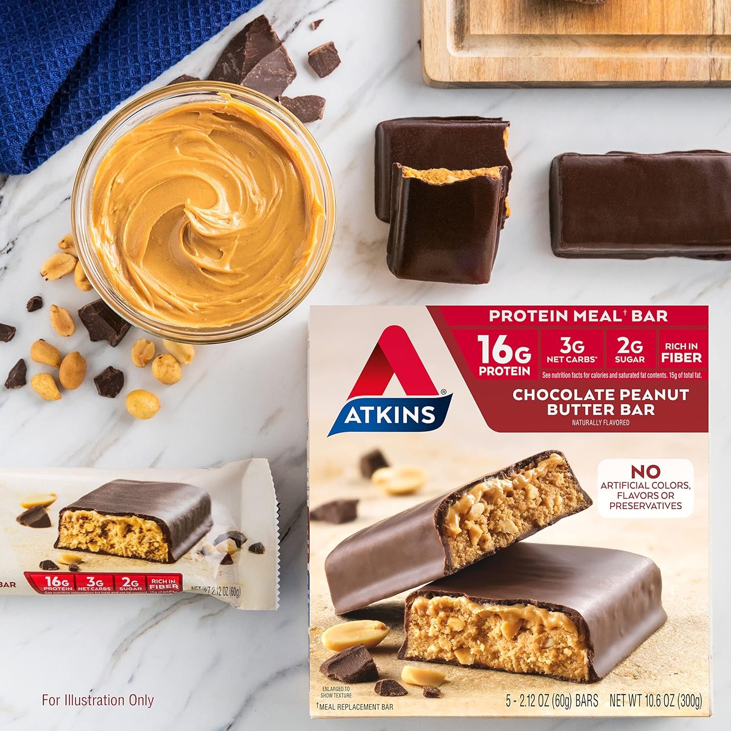AT HOME OR ON-THE-GO. Atkins Chocolate Peanut Butter Protein Meal Bars. Enjoy delicious meal bars that fit right into your busy schedule, 16g of protein, 2g of sugar, and 3g of net carbs per serving*. This is Today’s Atkins.