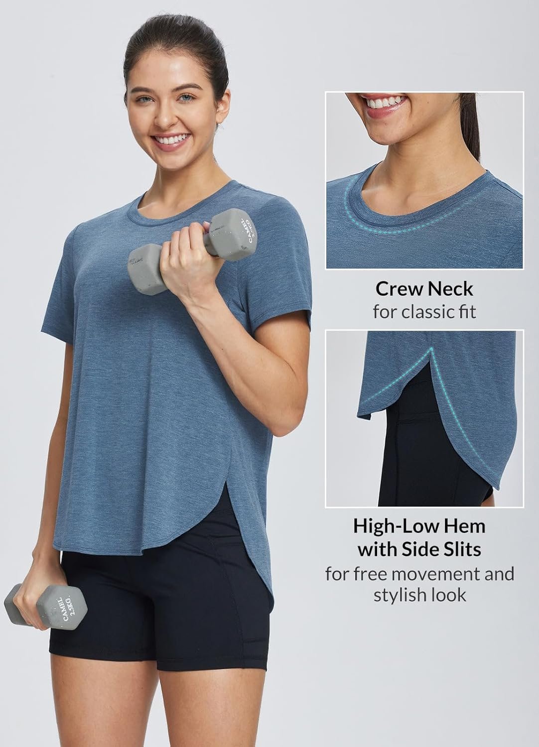 Customers find the workout top comfortable, soft, and appreciate its true-to-size fit with longer coverage in the back. The material quality is good, and customers describe it as lightweight and breathable. They like the flattering design, with one customer noting it’s particularly flattering in size L. The white color receives mixed feedback, with some customers finding it see-through.