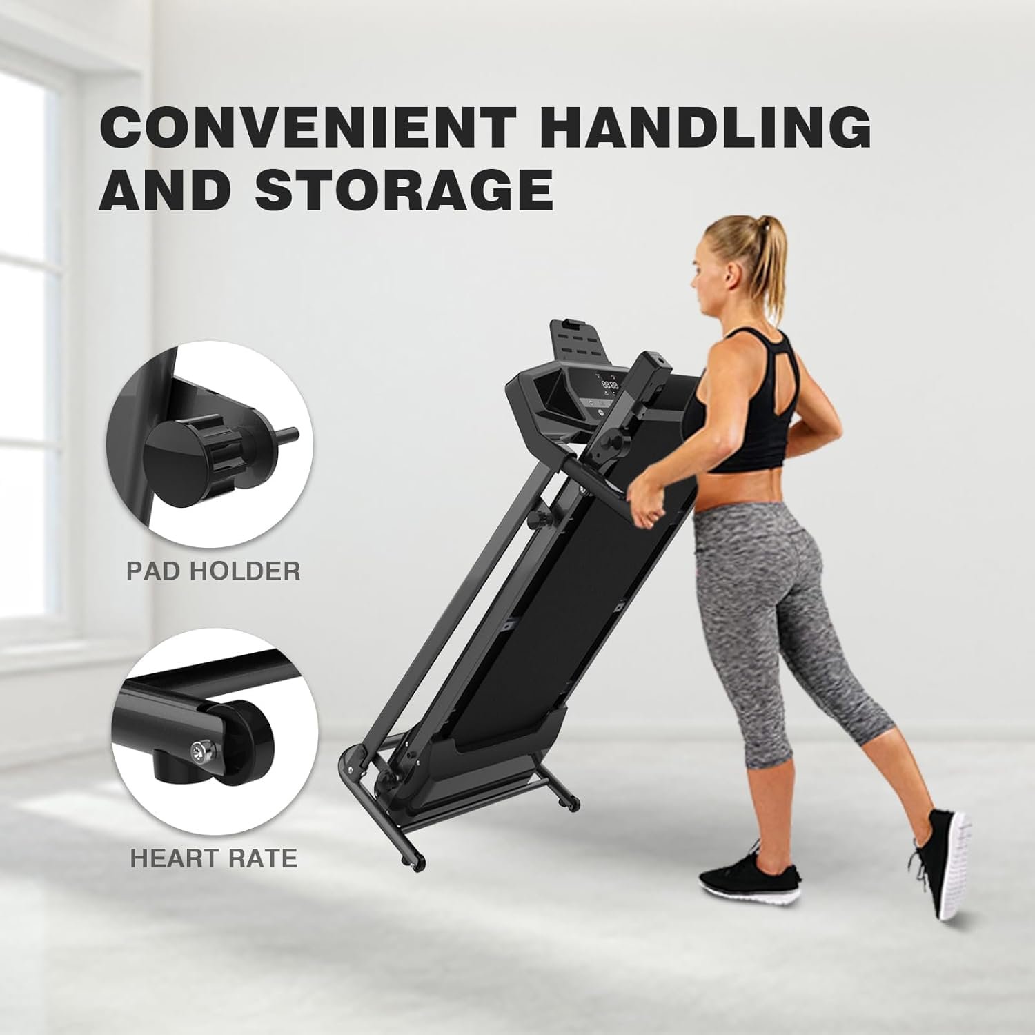 【Safety & Portability】: Equipped with a safety key, long handles, and a spacious 41.3’’ x 15’’ running belt, this treadmill ensures a safe and comfortable workout. The built-in wheels make it easy to move and store.