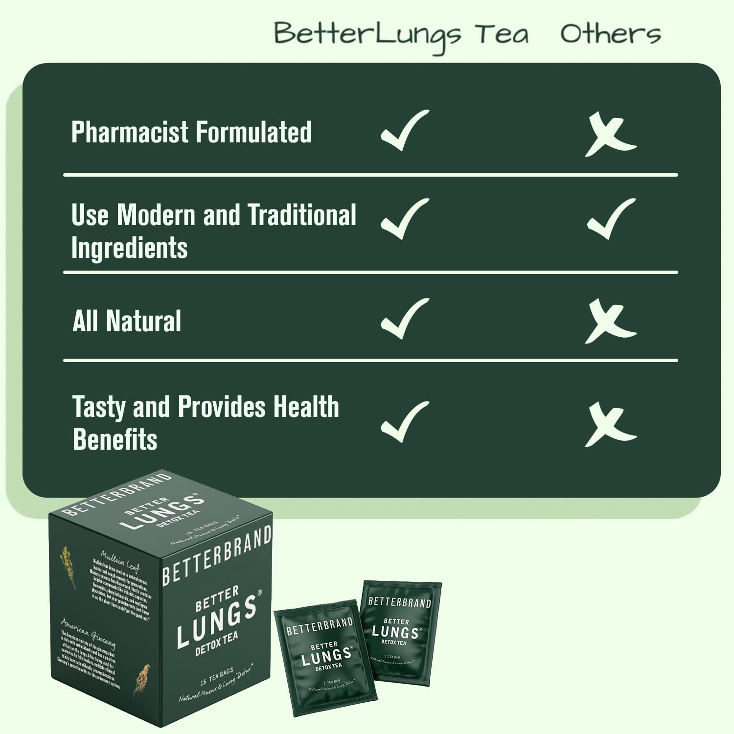 15 TEA BAGS FOR EASY USE – BetterLungs Tea comes in a convenient box that includes 15 individual tea bags, making it easy to enjoy on-the-go or at home. The tea bags are pre-portioned to ensure consistent and delicious flavor in every cup. BetterLungs Tea is a tasty and caffeine-free alternative to traditional caffeinated beverages that can be enjoyed daily.