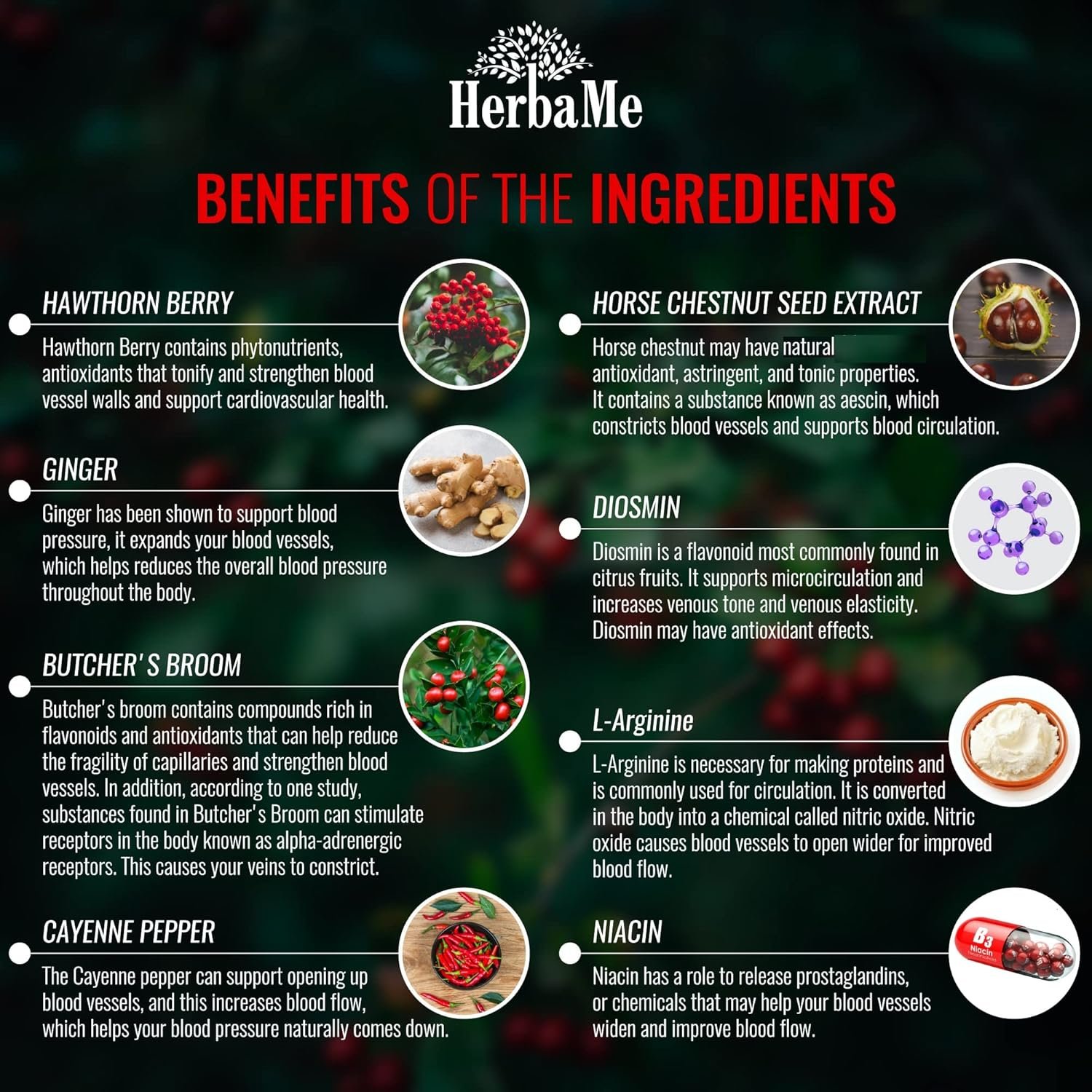 Blood Pressure Support – Rich in Niacin, Hawthorne, L-Arginine, Diosmin, Horse Chestnut and Ginger Root our poor circulation supplement can reduce pressure in the legs while fortifying vein health for a slimmer, more toned look with proper blood flow.