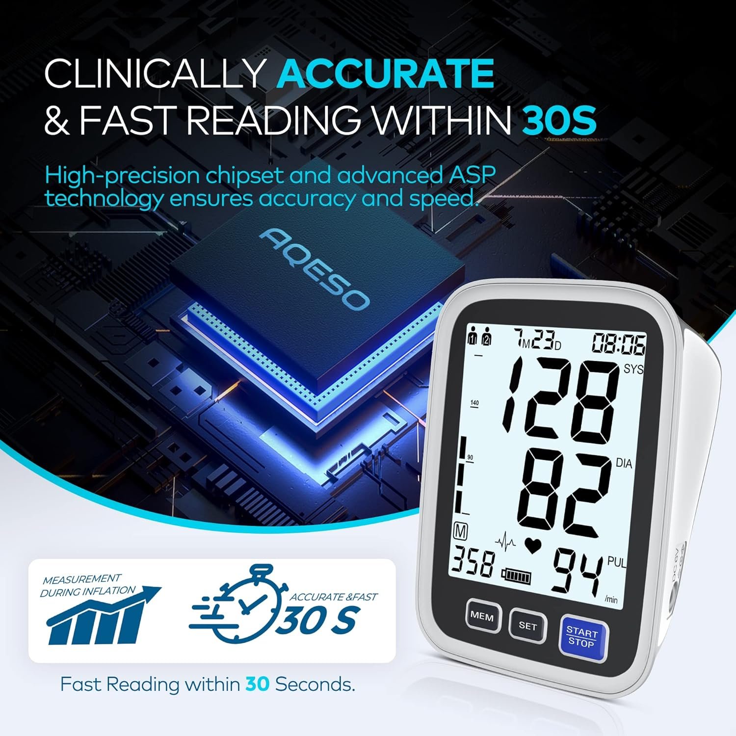 Tips for Accurate Blood Pressure Readings – Consider three key factors: proper body position for measuring, BP machine with proven accuracy, and well-fitted cuff. AQESO BP machine with ASP signal processing tech, 100,000+ clinical data tested, can deliver readings accurate and fast. To achieve greater accuracy, AQESO wide-range cuff solution offers cuffs for arms ranging from 7″ to 21″ in Small, Medium/Large & XL sizes, ensuring comfortable fit for all.
