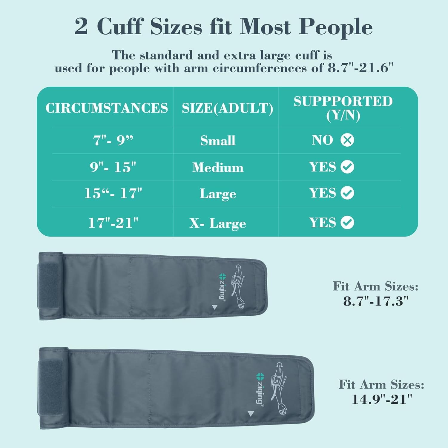 The cuff length is ranged from 22-44 cm(8.7~17.32inch)& 38-55cm(14.9~21.6inch) fits many adult people to measure.