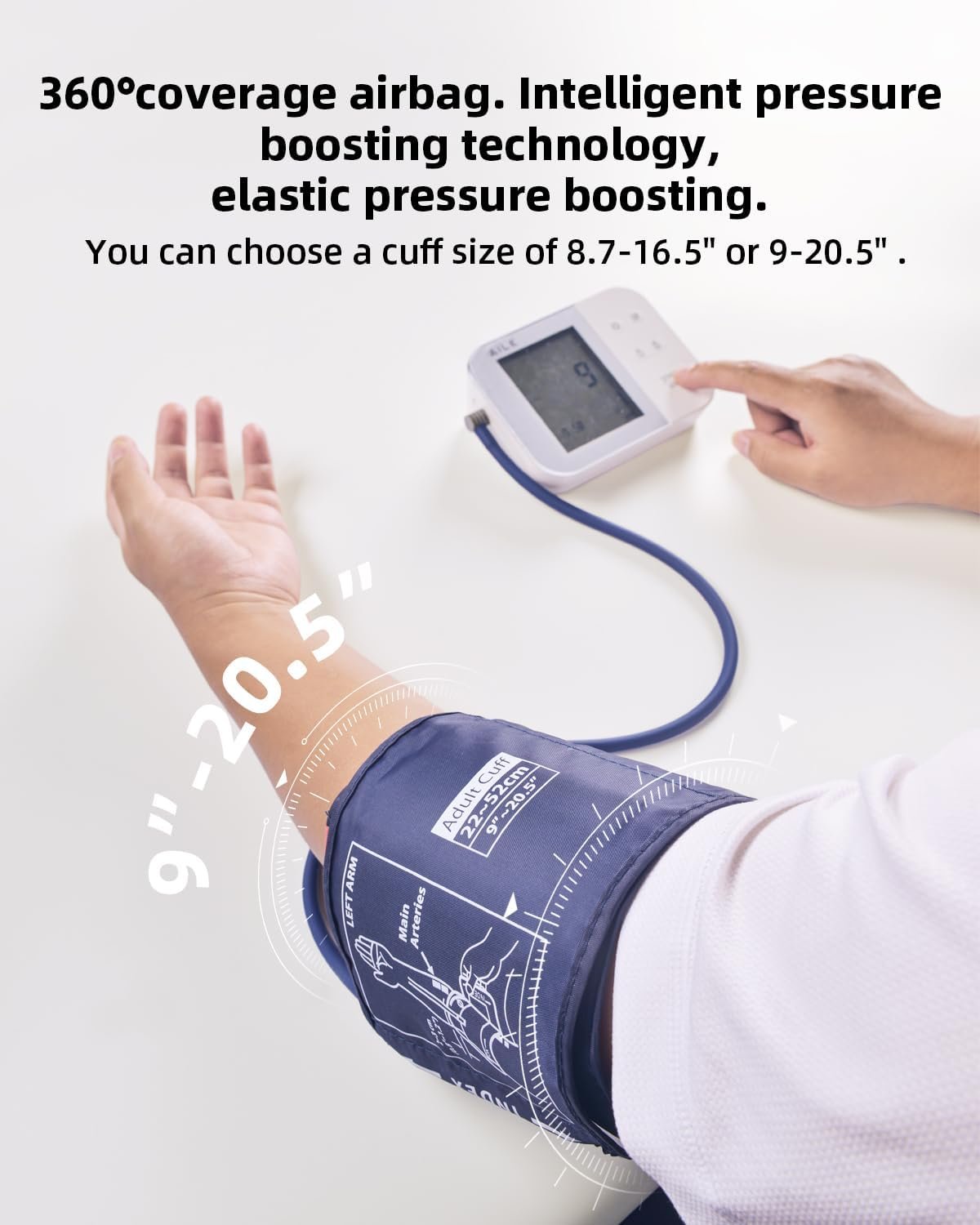 [Cuff Size Options Available] AILE provide TWO Blood Pressure Cuff for you choose. One is for arms ranging from 8.7-16.5″, and the other is for arms ranging from 9-20.5″. The cuff included in this blood pressure machine is 8.7-16.5″ in size. You can choose the style according to your needs