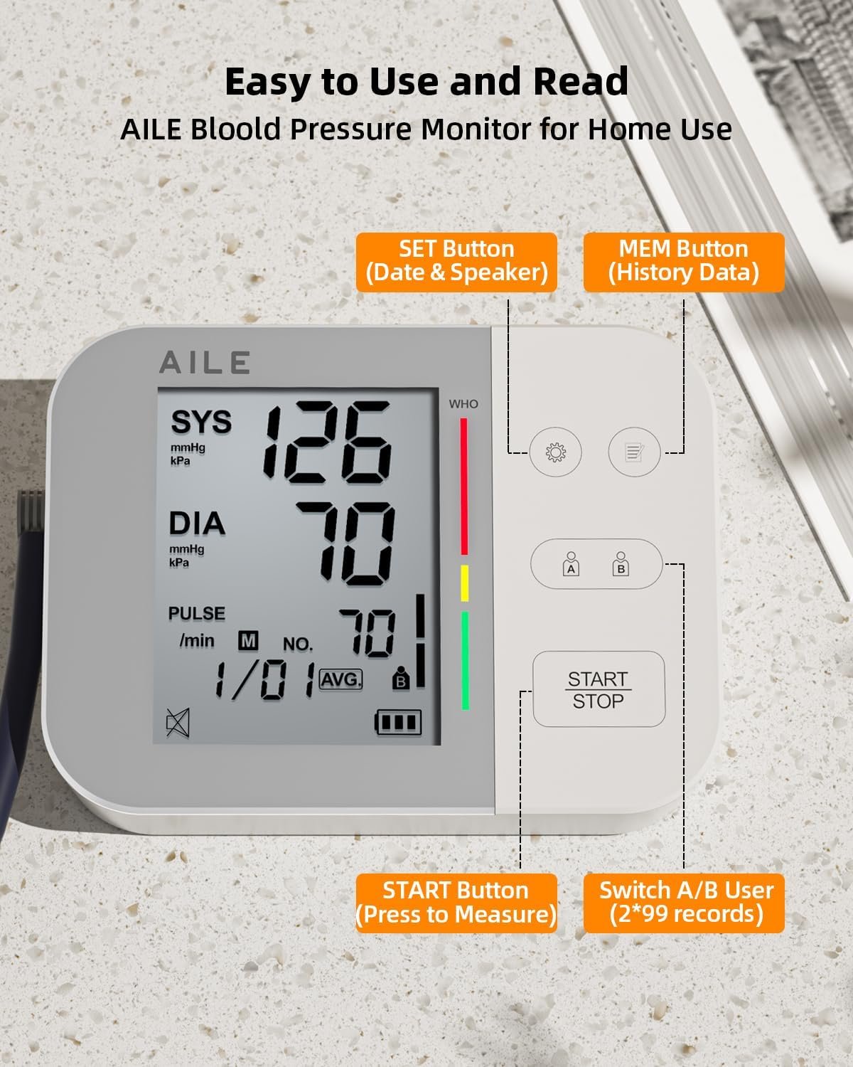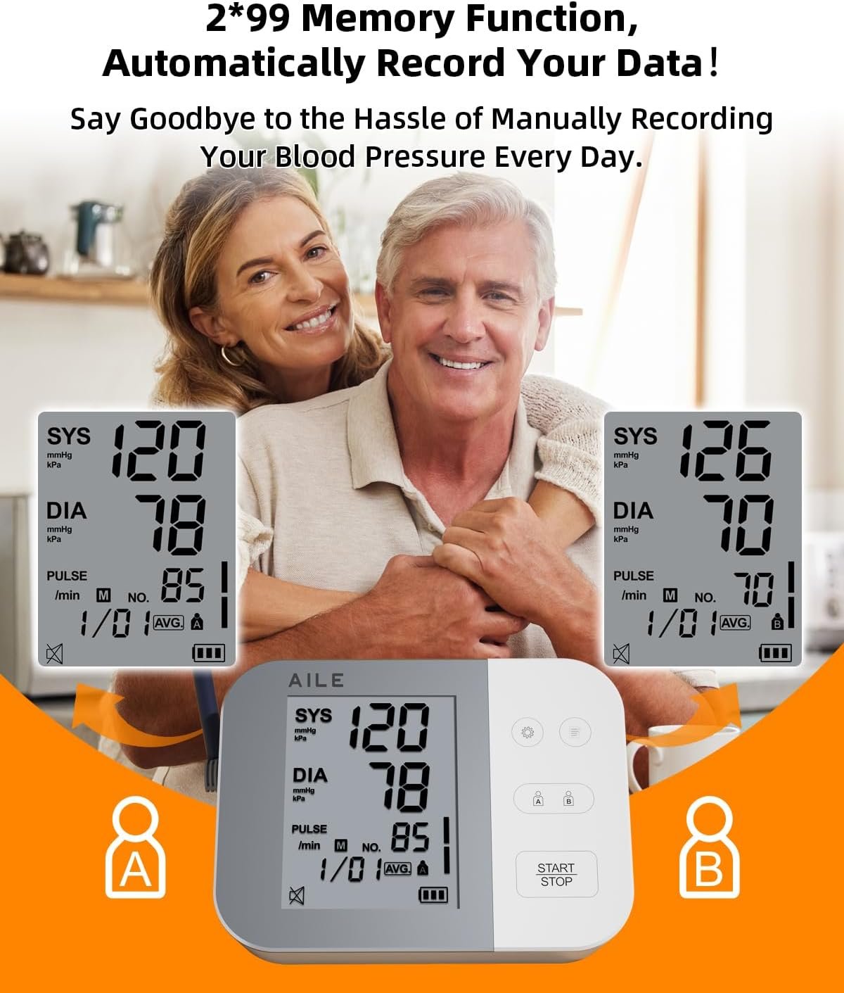 [Blood Pressure Monitors for Home Use] AILE Automatic Blood Pressure Machine can automatically record you and your whole family menbers’ blood pressure values (systolic, diastolic, and heart rate) with a time stamp, it can memery 99 records for each of its two users. You can easily view your measurement history with just one click, and also review it with your doctor