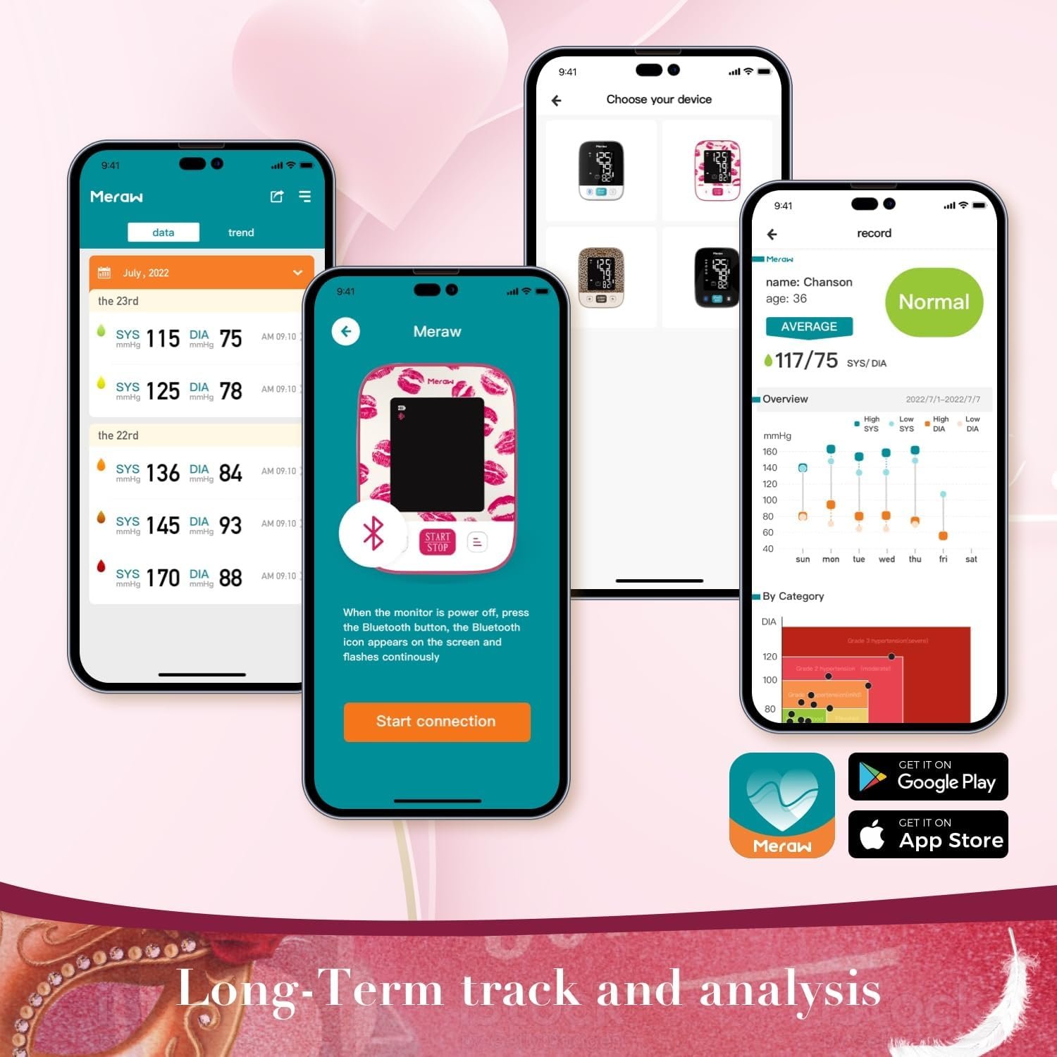 【Effortlessly Track Your Data and Trends with Meraw Health App】Our High Bluetooth blood pressure cuff is compatible with our Meraw Health App, allowing you to effortlessly track your blood pressure data, monitor trends, and share reports with your doctors and family.