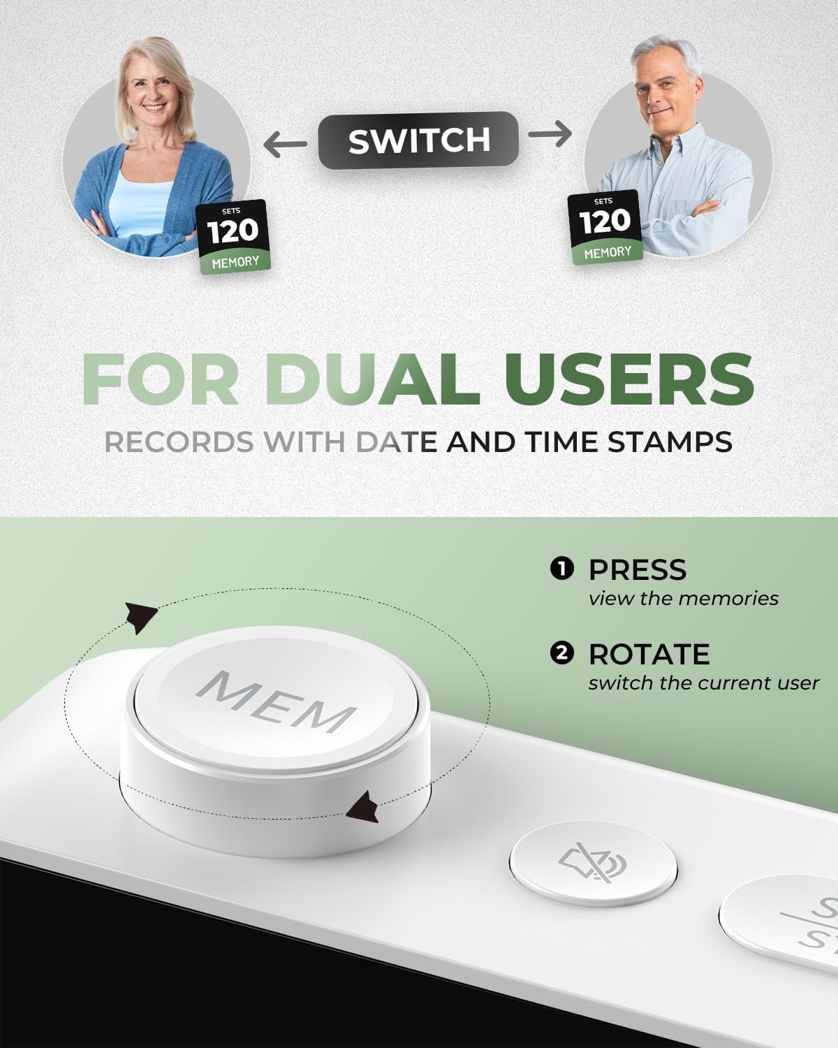 Dual-User Design & 240 Sets of Memory: One blood pressure monitor machine can be used by two users, and each can record up to 120 data sets; The dual-user recording is designed so that you can observe and record blood pressure data at the same time