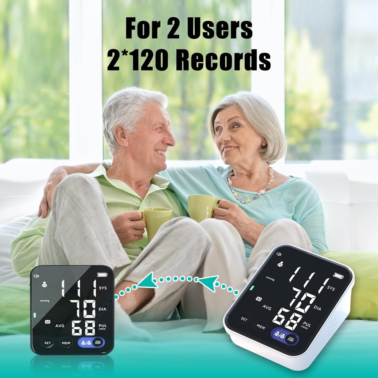 [120×2 Groups of Memory] The BP monitor works for 2 users with up to 240 readings (120 for each). You can switch between user 1 and user 2 by simply pressing the user button.Push the MEM button makes it hassle-free to check historical records for family members, allowing you to easily track their health, blood pressure and heart rate data according to the specific dates and times
