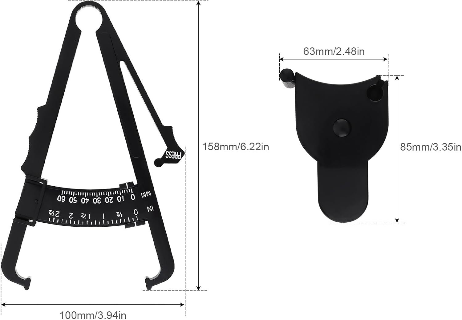 – Caliper Measure Range: 0-60mm / 0 – 2.5 inches; BMI Tape Measure Range: 0-150cm / 0-59 inches.