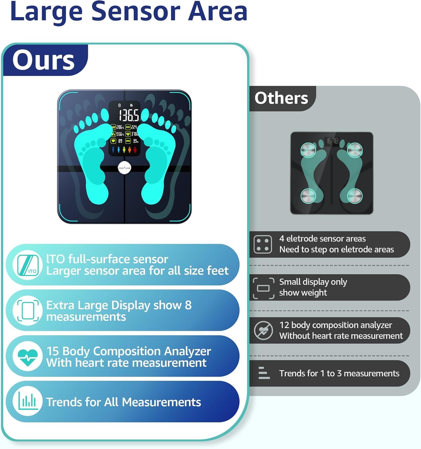 Super High Quality and Accuracy. Posture scale is equipped with 4 high precision G-shape sensors and 4 high sensitive electrodes, with advanced BIA technology to ensure your accurate readings with division at 0.2lb/100g, up to maximum capacity 400lb/180kg. With extra large display, low power / overload indication, step-on technology and 4xAAA batteries included.