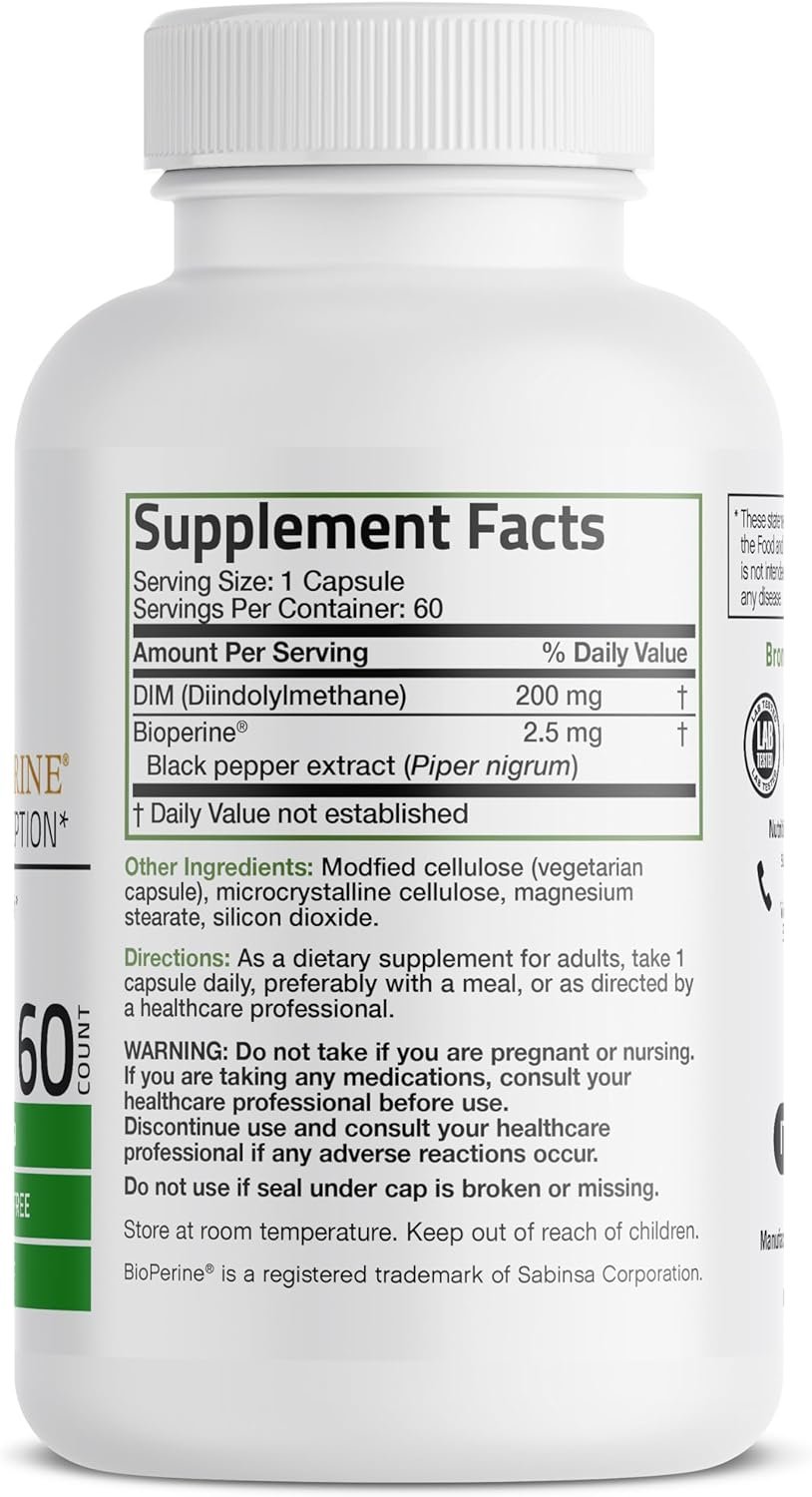 Bronson’s DIM with BioPerine provides 200 MG of pure DIM per vegetarian capsule to support healthy estrogen metabolism and help maintain balanced hormone levels in the body.* DIM, which is a compound naturally found in cruciferous vegetables like cabbage, broccoli, cauliflower, and more, has been shown to help support healthy estrogen levels. By assisting in restoring balanced hormones, DIM helps adjust less favorable forms of estrogen to more positive forms.* Additionally, DIM 200 MG is enhanced with BioPerine to promote healthy absorption.* In-house laboratory tested and free of GMOs, Gluten and Soy at our state of the art GMP Registered New York Facility.