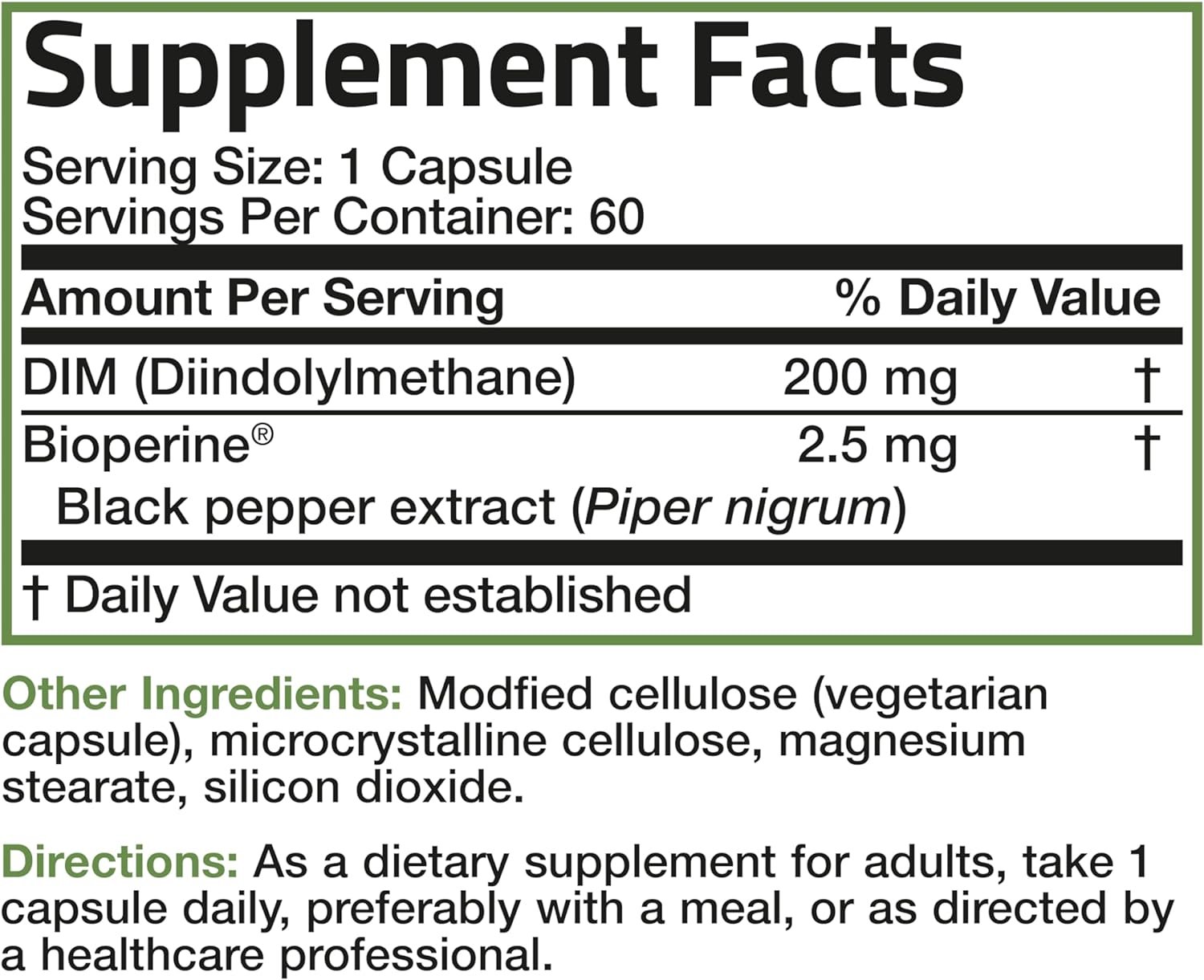 Healthy Estrogen Metabolism: Bronson’s DIM with BioPerine provides 200 MG of pure DIM per vegetarian capsule to support healthy levels of favorable estrogen while controlling harmful forms of estrogen.* Suitable for both males and females, DIM 200 MG is enhanced with BioPerine to assist with fast absorption.
