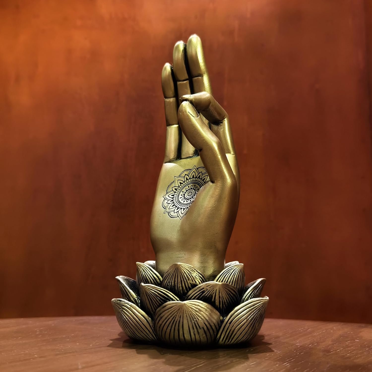 Buddha mudras hand décor, adorned with mandala patterns and Lotus base. Brass finish. Put it on the shelves, look at the spiritual gestures and enjoy the tranquil life.This statue is made of good quality resin. It is hard to turn over and break because of the heavy base and non-slip mat.