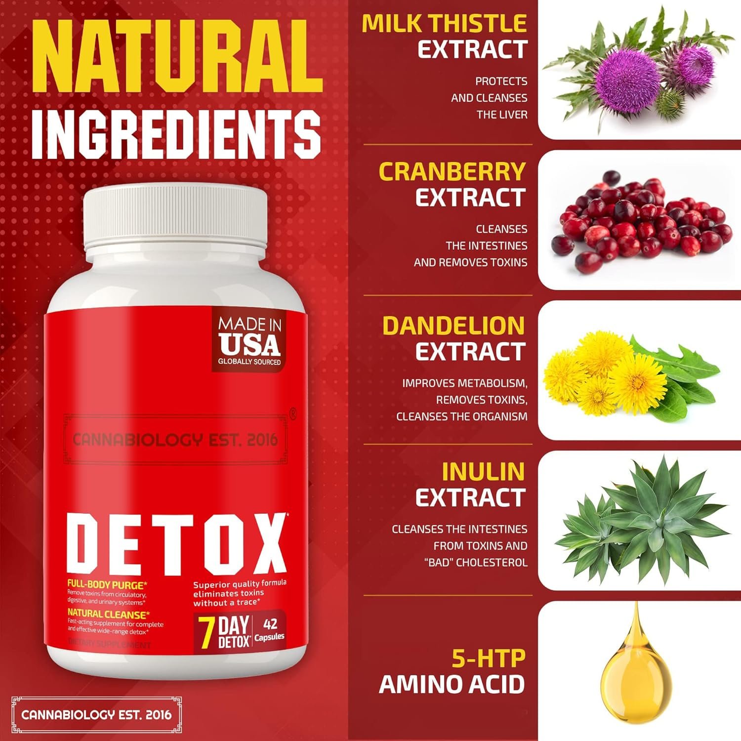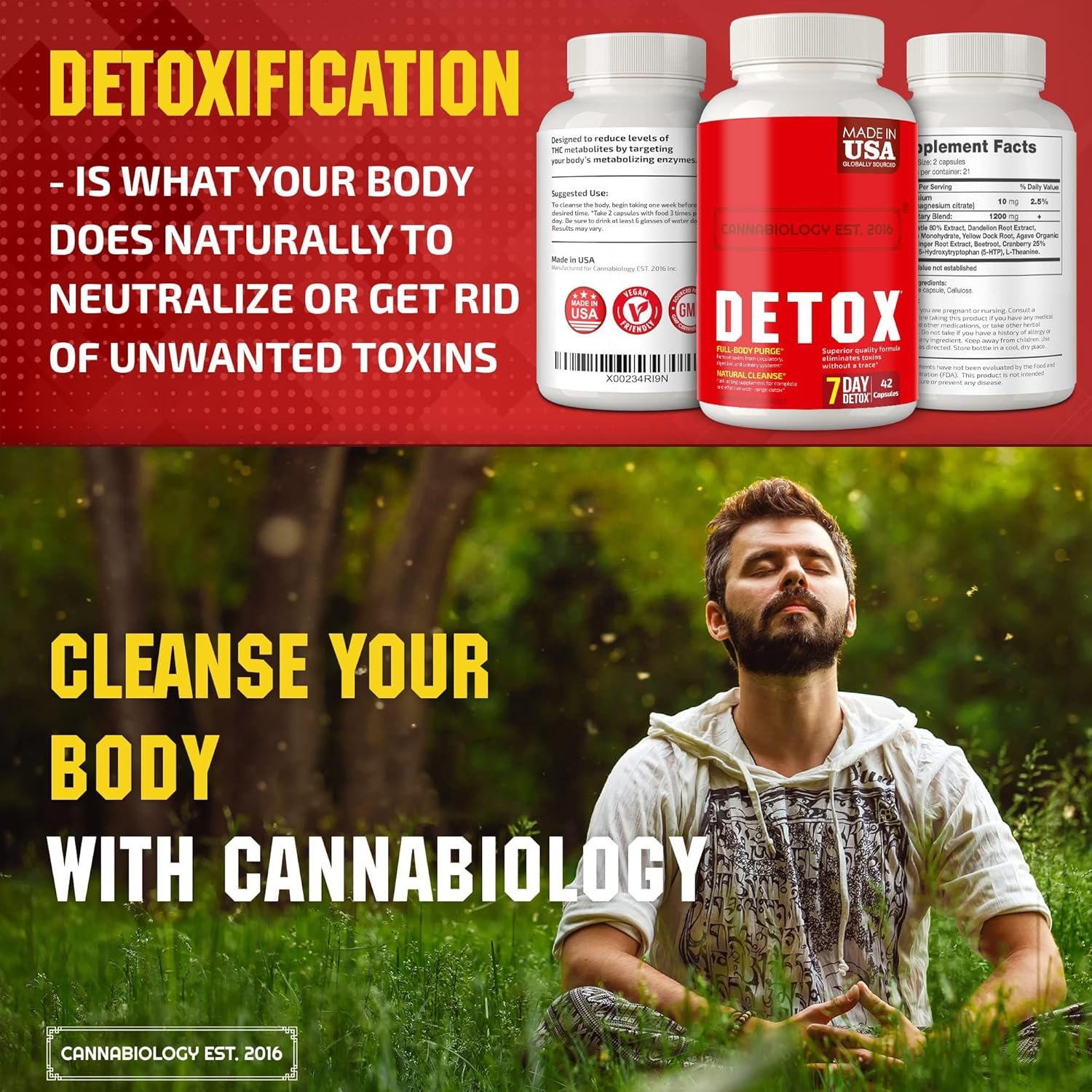 The Complete Body Cleanse by Cannabiology Est. 2016 is a natural and healthy cleansing support supplement for your liver, urinary tract, kidney, and digestive system. This vegan supplement is made in the United States and contains 42 capsules. The therapeutic-grade formula of these capsules supports long-term well-being by cleansing your digestive, kidney, liver, and blood systems. The powerful blend of natural ingredients works for a full system cleanse and natural detox support, ensuring your body is functioning at its best. One of the key benefits of this product is its ability to rapidly eliminate toxins from your body. The capsules are designed to reduce toxin elimination timeframes and offer wide-range detox in just a week. This makes it an ideal choice for those who need a quick detox and body cleanse. The Complete Body Cleanse capsules contain an optimal dose of needed molecules for efficient detox. It is 100% vegan and free of fillers, binders, and artificial ingredients, making it an ideal choice for natural detox and purity. Cannabiology Est. 2016 is a brand that values customer satisfaction and strives to provide exceptional support. Their product is proudly made in the USA, so you can be assured of its quality and safety. If you have any questions or concerns, their customer support team is always available to help and make things right.