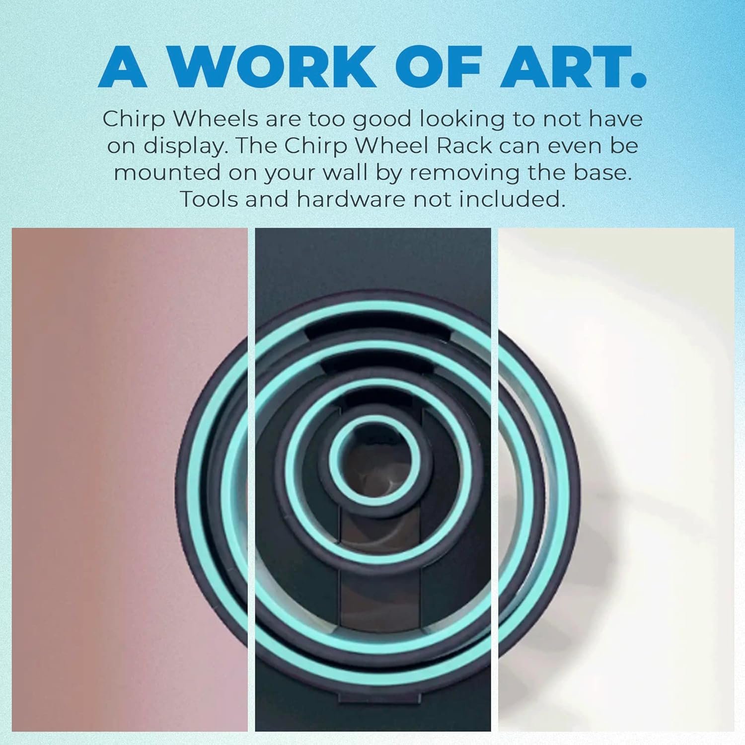 A WORK OF ART: Let’s face it, Chirp Wheels are too good looking to not have on display. The Chirp Wheel Rack can even be mounted on your wall by removing the base. Tools and hardware not included.