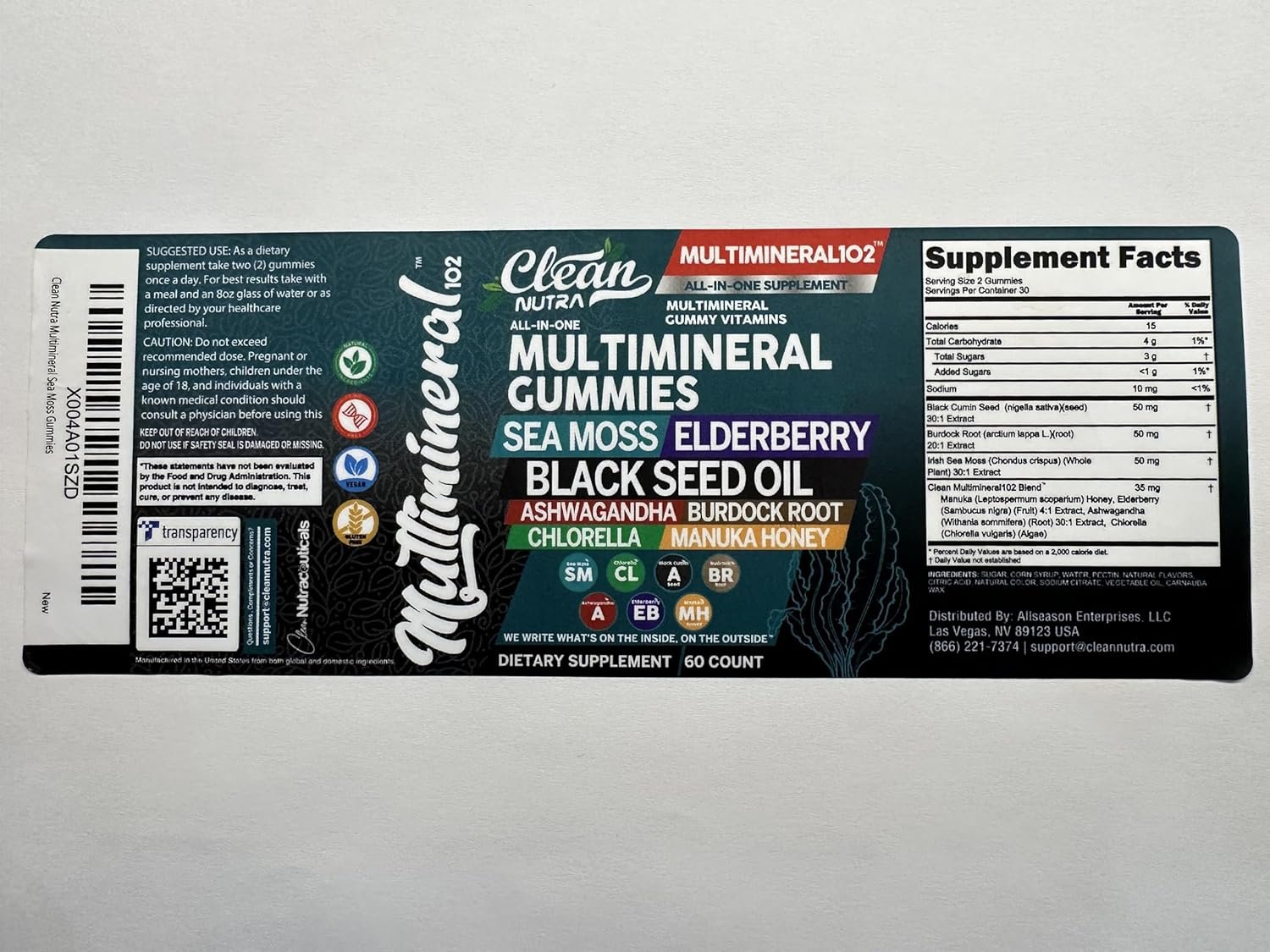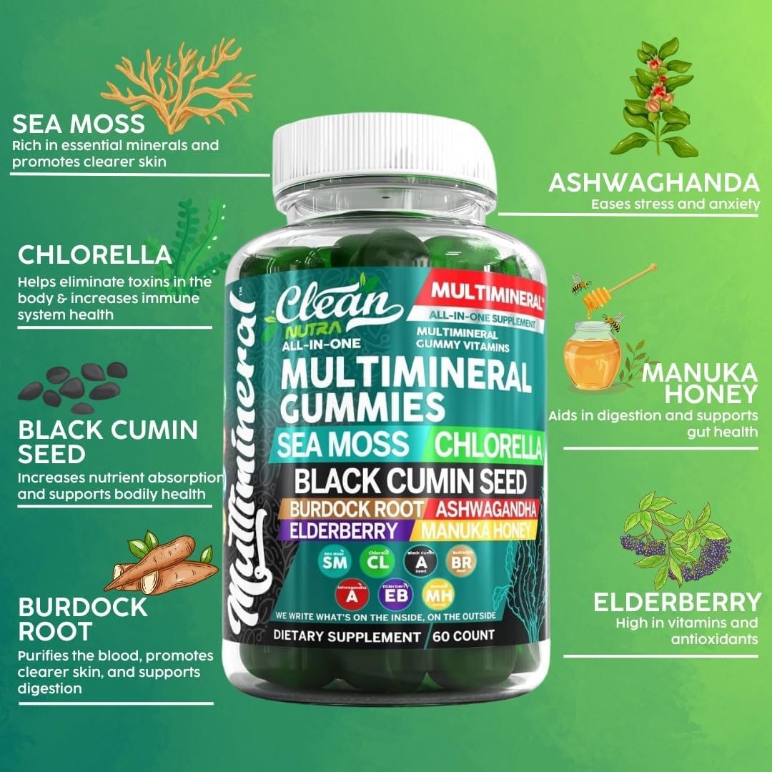 Clean Nutra Sea Moss Gummy All In One Mineral Supplement: Seamoss gummies formulated with key nutrients like black seed oil organic cold-pressed, ashwagandha gummies, elderberry gummies, burdock root organic, organic chlorella, and manuka honey gummies to deliver a well-rounded supplement. Each gummy vitamin is gluten-free and features a delicious green apple flavor.