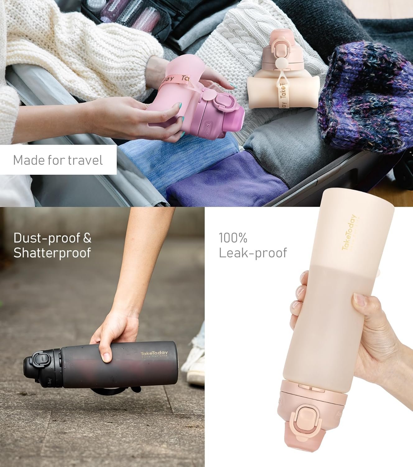 Taketoday collapsible water bottle can be compressed or folded down to a compact size when not in use, making it easy to carry and store. When the silicone water bottle is filled with water, it expands to its full size, and when empty, it can be collapsed or folded down to a much smaller size, taking up minimal space in your backpack or handbag. Stylish collapsible water bottles are popular choice for outdoor activities and travel.The silicone water bottle is made of food-grade platinum liquid silicone which is BPA-free, phthalates-free,non-toxic. The water bottle is eco-friendly and recyclable, reducing the need for disposable plastic water bottles. The reusable water bottle is sturdy and highly resistant to impact and corrosion.Taketoday collapsible water bottles with straw are also motivational water bottles for tracking your daily hydration, it also can be used as a water bottle with strap, you can take the water bottle for many outdoor activities or travels.A collapsible water bottle is a great option for hiking and backpacking, as it can be easily packed away when empty. As a flight, cruise ship and hiking essentials, it can be attached to a backpack using a carabiner and provides a convenient source of hydration on the go. A collapsible water bottle is a space-saving option for camping, as it can be easily stored in a backpack or a camping bag. It can be taken on long hikes, fishing trips, or kayaking trips.A collapsible water bottle is perfect for traveling as it can be easily emptied to go through security checkpoints and can be refilled once past security. It can be folded or rolled up and is a lightweight option for travelers. A collapsible water bottle is a convenient option for carrying water to the gym, running, or cycling. It can be attached to a bike frame or carried in a pocket for easy access to hydration.