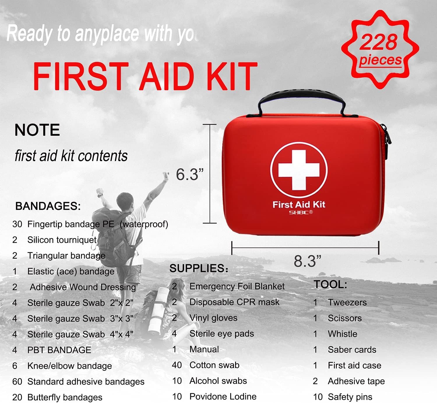The basic 228 pieces of comprehensive first aid treatment products is manufactured from the Modern aseptic facility, exceeding safety standards for emergency first aid for adults and kids. See the product images and the product description below for a full list of contents.