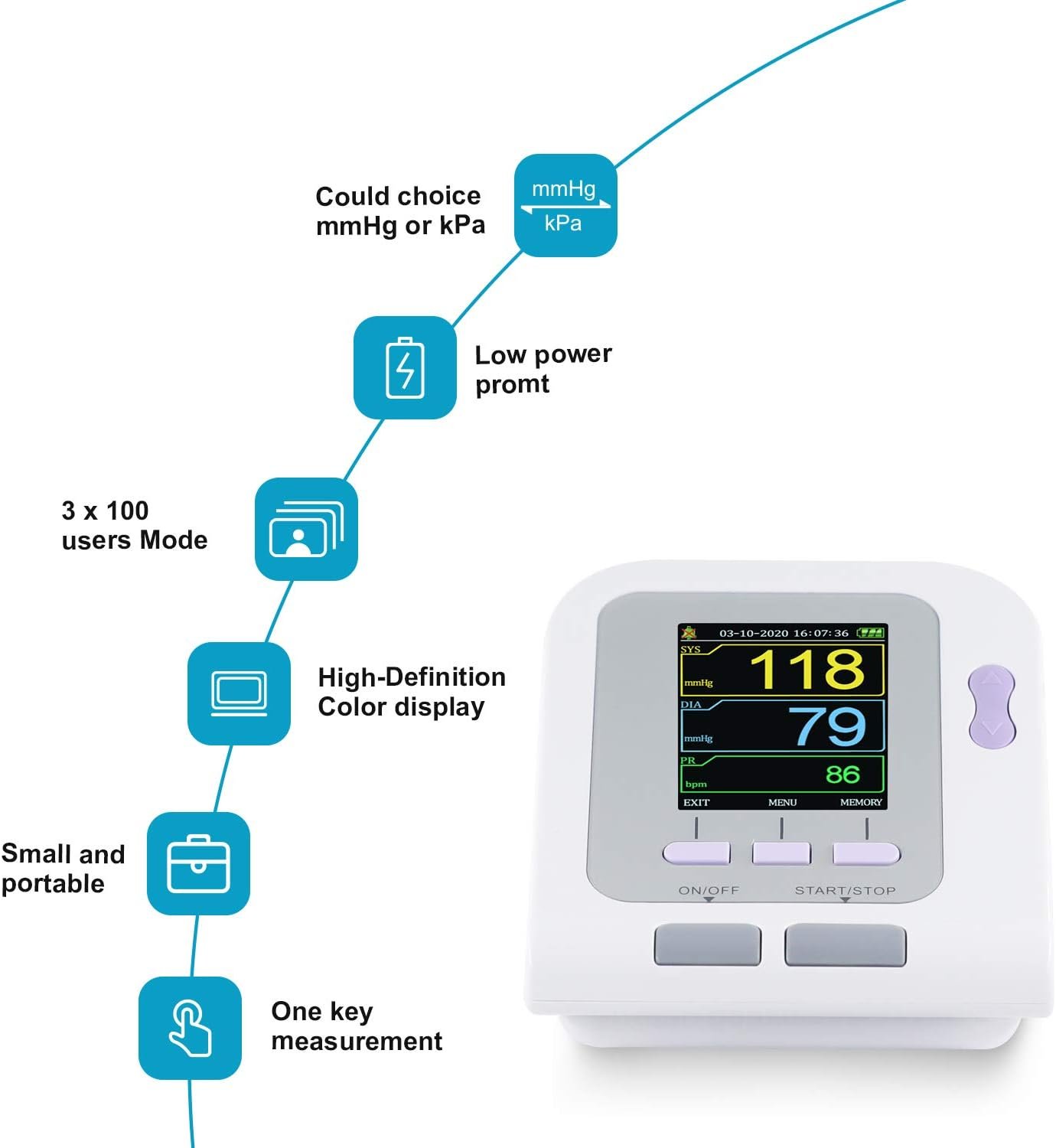2.Three kinds of measure modes : adult, pediatric and neonatal. By data review interface such as “data list”,”trend graph”,”big font”, NIBP data is clear at a glance.