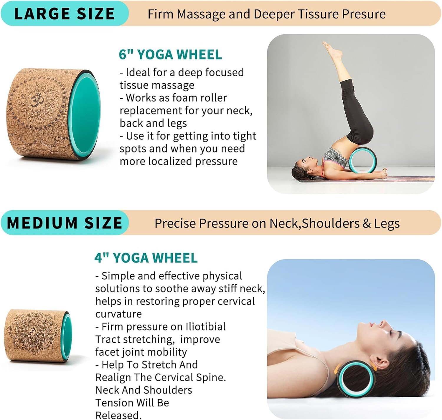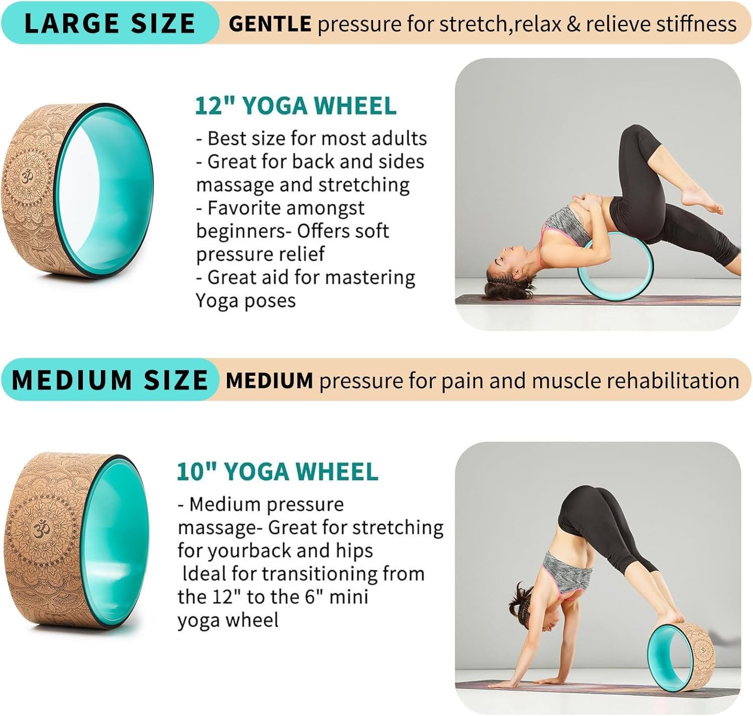Yoga Wheel Set of 3 + 1:The 4 sizes wheel provide different levels of pressure to the muscles targeted to your specific training needs. Our big wheels are 13 inches in diameter with gentle pressure and are excellent for deep posture and backbending. Our 10 “medium pressure rollers are perfect for stretching your back and hips, the smallest being 6” in diameter with deep tissue pressure, perfect for massaging the neck, back and legs.