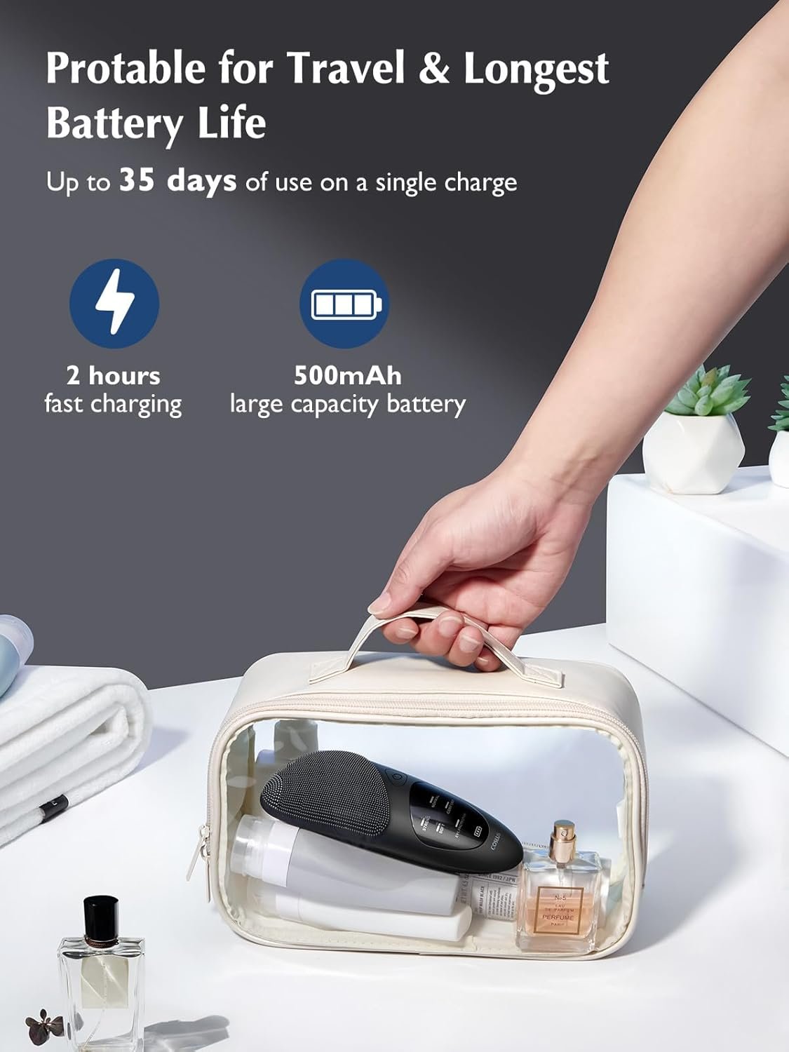 35 DAYS SUPER BATTERY LIFE: COSLUS silicone face scrubber has a built-in 500mAh large-capacity environmentally friendly battery, which only takes 2 hours to fully charge and can be used continuously for more than 35 days. The facial cleanser brush comes with a storage box and storage bag, making it easy to store at home or traveling, so you can enjoy spa-grade facial treatments at any time