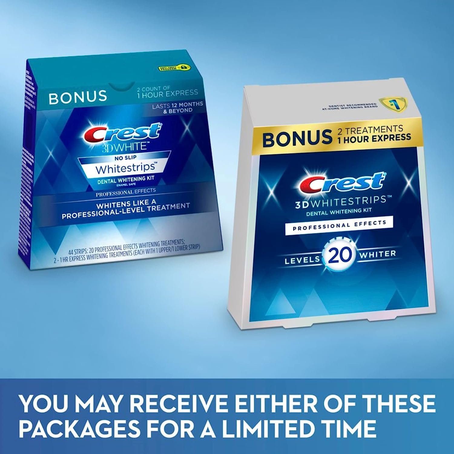 Want to your whiten teeth at home? Crest 3DWhitestrips Professional Effects + 1 Hour Express bonus offering is designed to whiten like a professional-level teeth whitening treatment at-home. The Advanced Seal Technology�s comfortable, no-slip grip means the strips stay put until you take them off, allowing you to talk and even drink water while whitening your teeth. Made by the #1 dentist-recommended at-home teeth whitening brand, Crest 3DWhitestrips Professional Effects will give you a 100% noticeably whiter smile, guaranteed. Using the same hydrogen peroxide whitening ingredient as dentists, this enamel safe at-home teeth whitening kit will make your teeth 20 levels whiter. Simply apply 20 treatments of Crest 3DWhitestrips Professional Effects for 45 minutes a day and 2 treatments of 1 Hour Express for 60 minutes. This pack includes 44 teeth whitening strips, 22 for your top teeth and 22 for your bottom teeth, to be used over the course of 22 days.