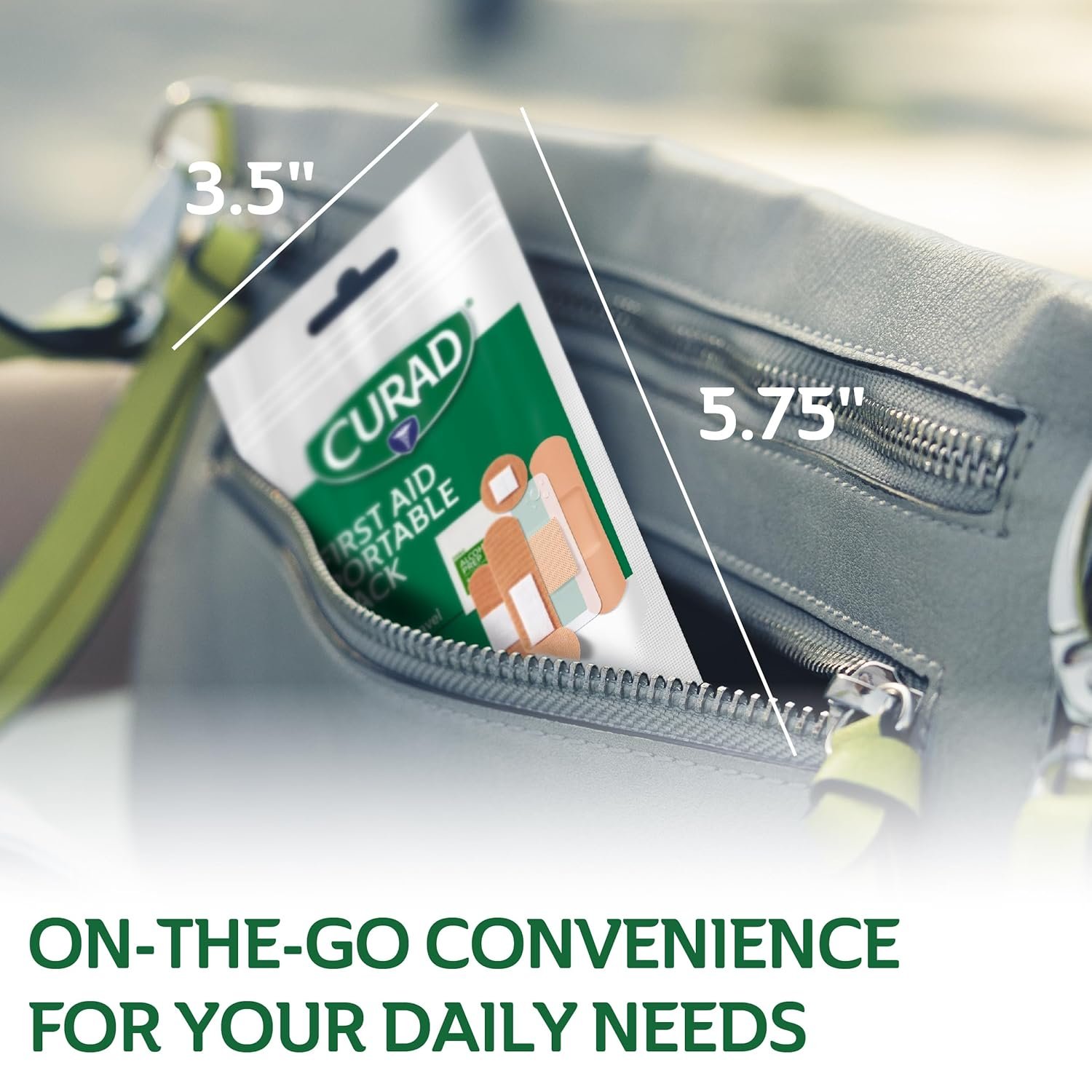 The CURAD First Aid Portable Pack, 15 count offers the first aid essentials. Great for on-the-go wound care, this Portable Pack contains everything to keep you covered when you need it most. It contains multiple sizes and types of bandages, including versatile Flex-Fabric, Waterproof, Plastic and Spot bandages. It also includes alcohol swabs to provide excellent cleansing action.