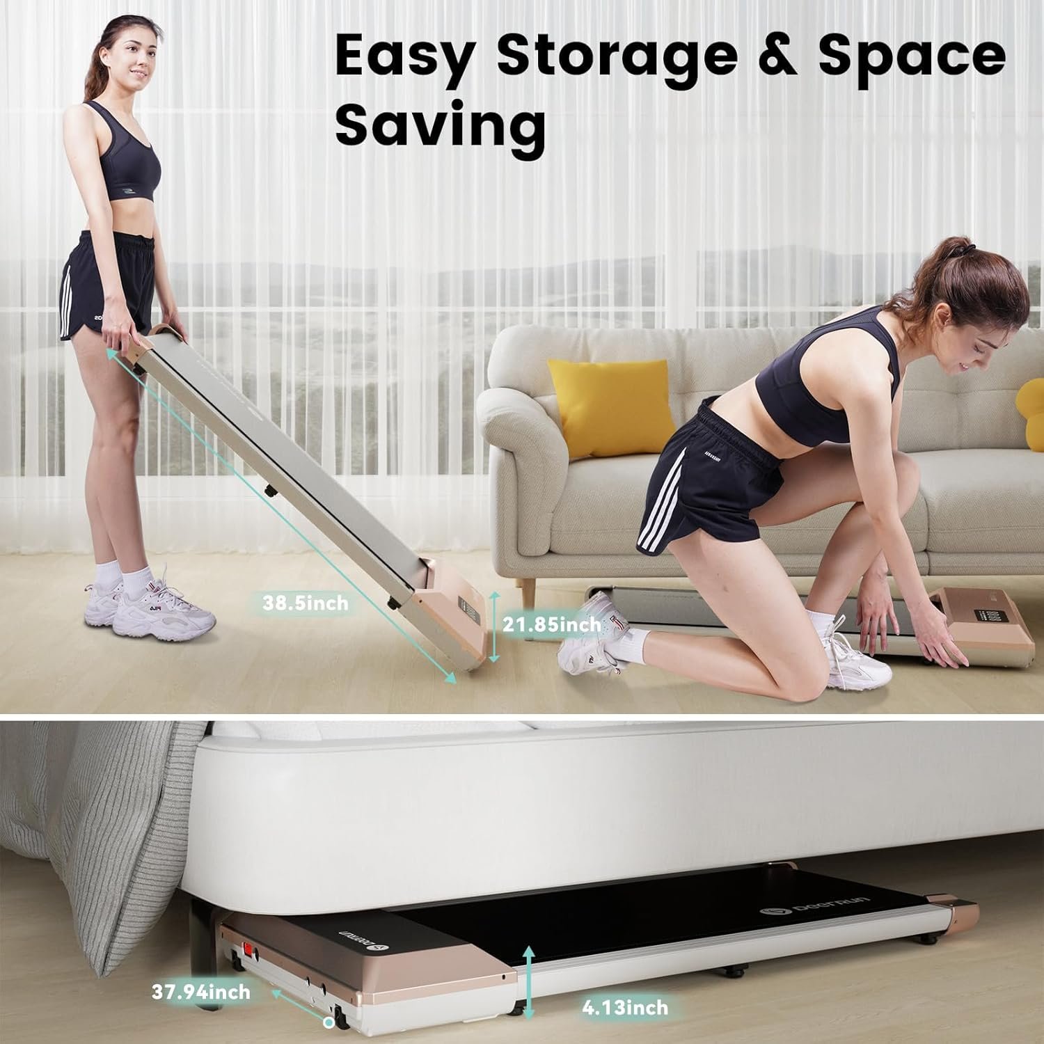 【Compact & Protable for Home Office Use】Slim and lightweight, thickness of our under desk treadmill is only 4.13”, which is easy to be used under your standing desk whether at home or in the office. With its compact size of 38.5″D x 20.24″W x 4.13″H and transporting wheels, you can easily stored the walking pad under the office desk, bed or sofa or other for small spaces. Both men and women can easily move this walking treadmill.