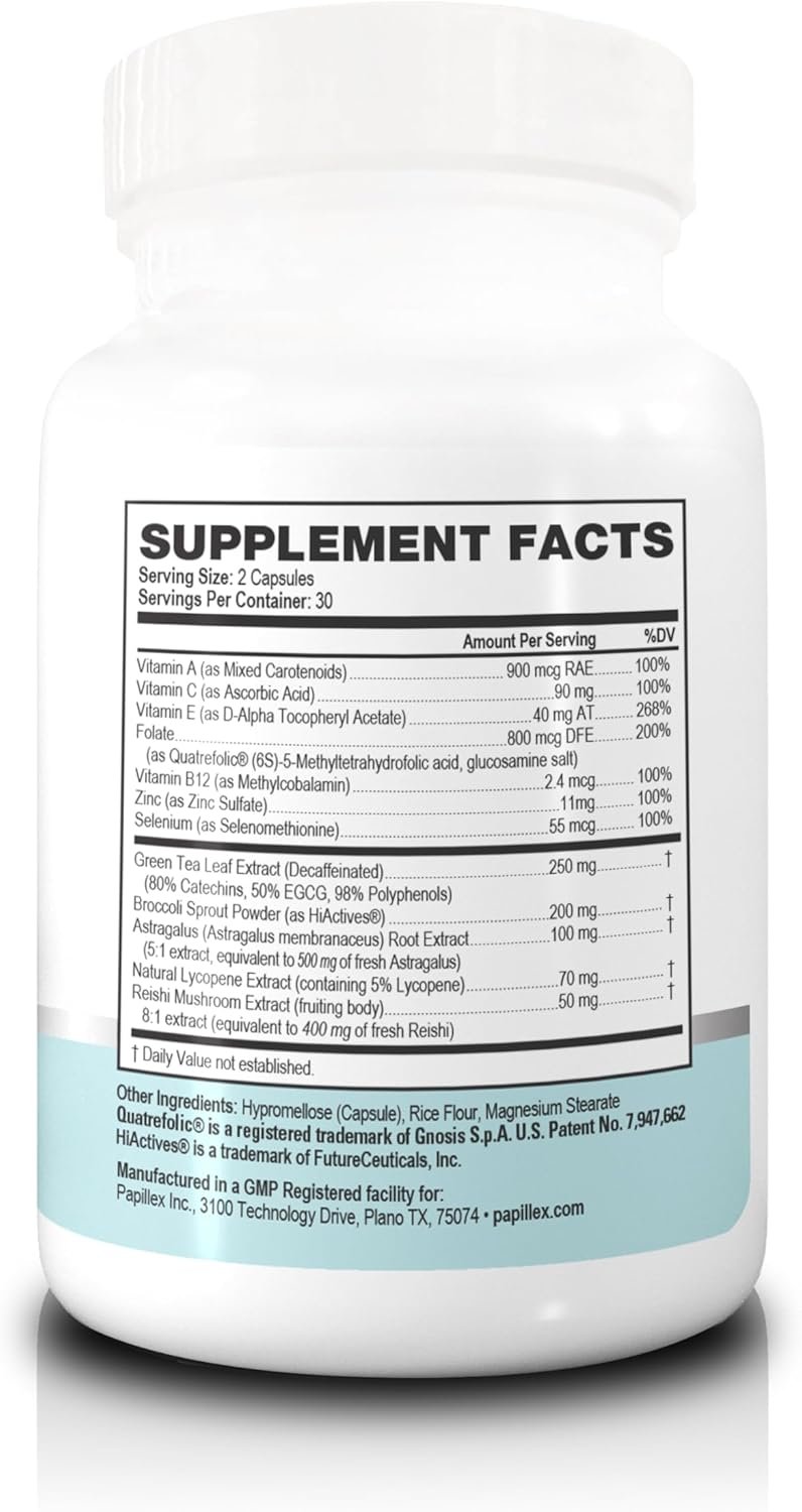 FORMULA – Lycopene & Carotenoids, Broccoli Sprout Extract, Green Tea Extract, Folate, Vitamins C, E & B12, Zinc, Selenium, Astragalus, and Reishi Mushroom.