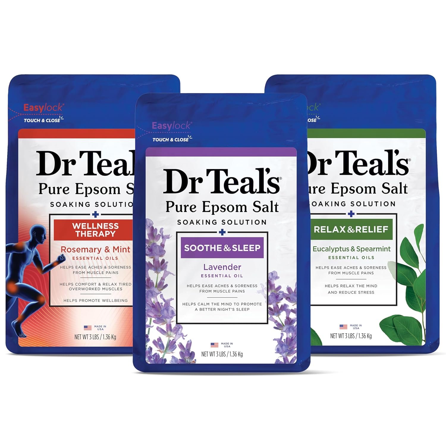 Experience relaxation, stress relief, and wellness with Dr Teal’s Lavender, Eucalyptus & Wellness Pure Epsom Salt Trio. Each soaking solution features our signature Pure Epsom Salt to ease muscle aches and soreness. Help calm your mind before sleep with soothing lavender. Eucalyptus and spearmint will help clear your senses and reduce stress. Indulge in rosemary and mint to soften your skin and comfort your overexerted muscles. Soak in one of these self-care solutions or mix with your favorite Dr Teal’s body wash to create an exfoliant. Dr Teal’s products are vegan and cruelty-free and contain no harsh ingredients such as parabens and phthalates.