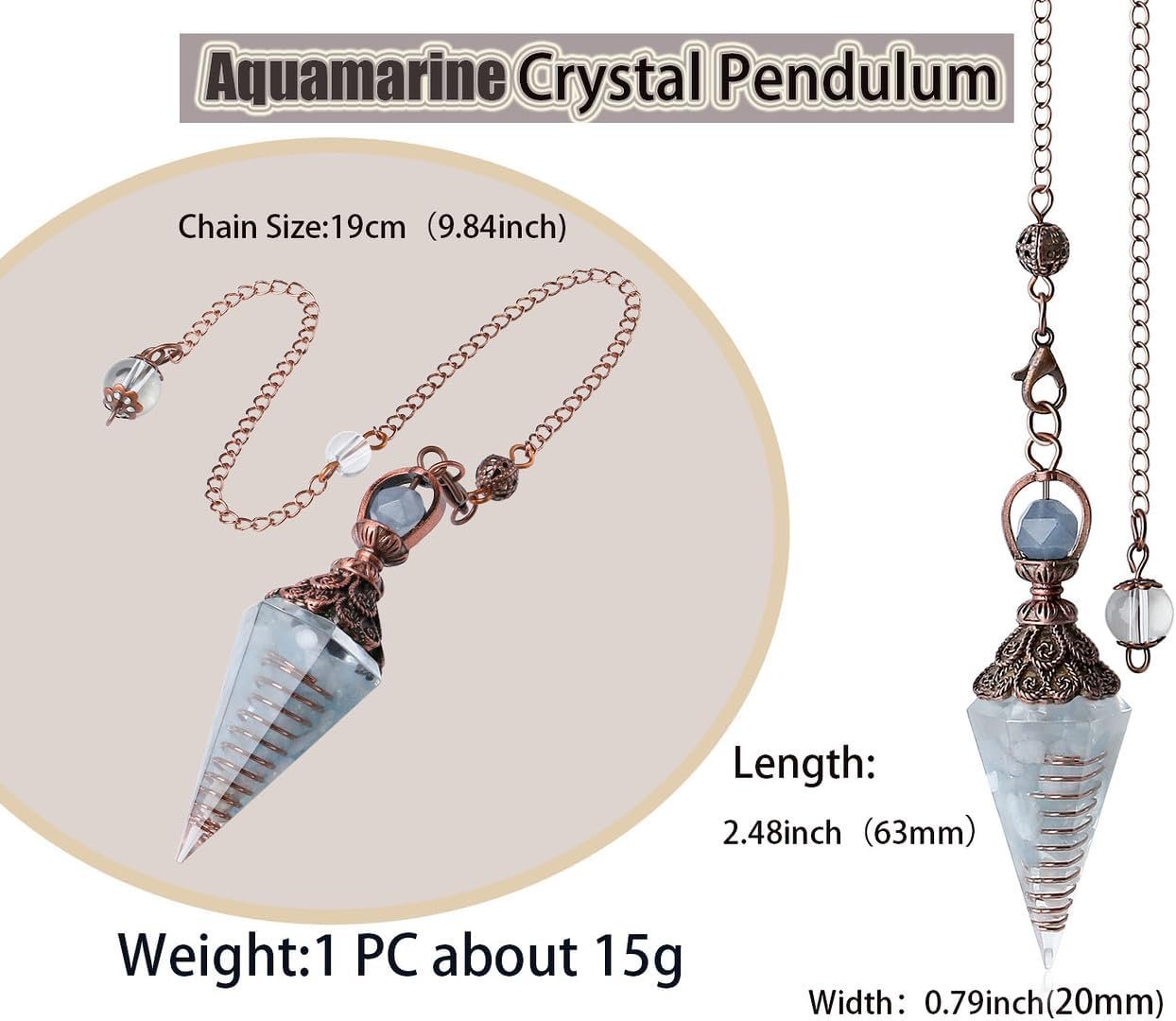 [SPECIFICATION]Color,bronze Aquamarine.Material,natural Aquamarine crystal copper and resin.Size,Length,About 2.48″(63 mm).Width,about 0.79″(20 mm). Copper pendulum chain,About 19 cm(9.84″). weight,about 15g. Package,we are already packed pendulums with box, .When you receive the pendulum, please clean it before use.