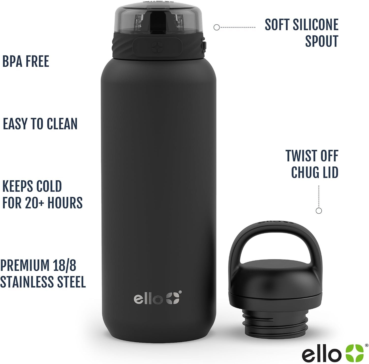The Ello Cooper 18oz, 22oz, 32oz, and 40oz Vacuum Insulated Stainless Steel Water. Choose between two lid options: a soft silicone spout with a locking, leak-proof flip lid to keep the drink surface fully covered during transport, or a wide mouth twist cap perfect for work, workouts, or staying hydrated at home. The Cooper keeps drinks cold for over 20 hours and is made from 18/8 stainless steel with an ultra-durable powder coat finish that won’t chip or rust. All parts are BPA-free and top-rack dishwasher safe. Plus, the 18oz and 22oz sizes fit most car cup holders.